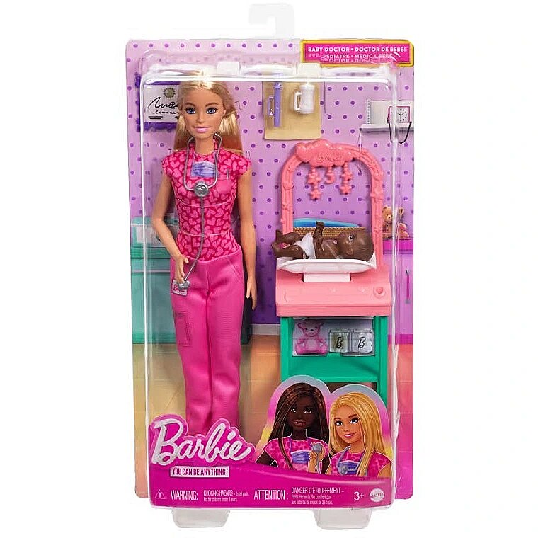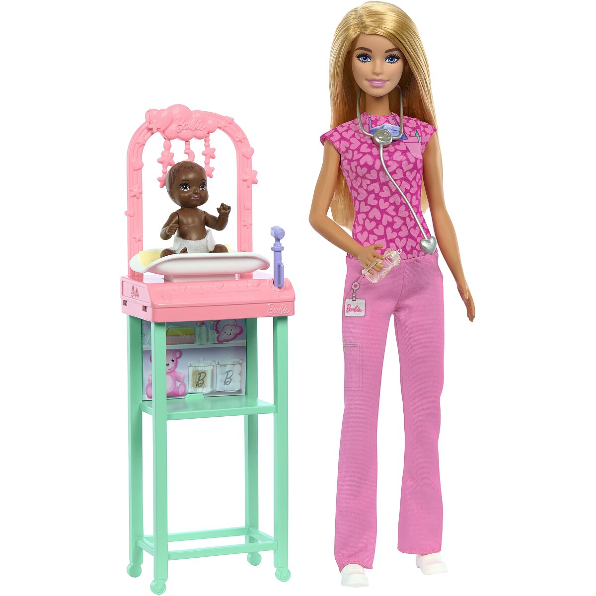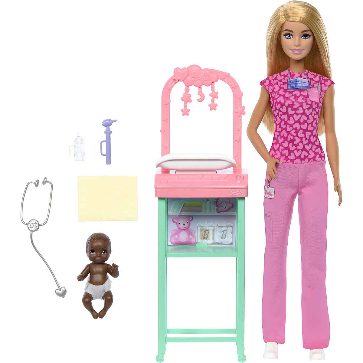 LongDesc - Kids can explore all kinds of career roles, including a Baby Doctor! This set includes a baby doctor environment including Barbie and her adorable baby doll patient! Barbie is wearing her pink heart print scrub set, ready to keep babies happy and healthy! The set also includes her examination table with Stars overhead and a shelf underneath to hold all the accessories, like a baby bottle or Barbie's stethoscope. Imaginations can play out a world full of storytelling possibilities and career opportunities with this powerful doll, ready to inspire kids to be anything! Doll cannot stand alone. Colours and decorations may vary.