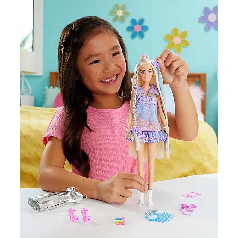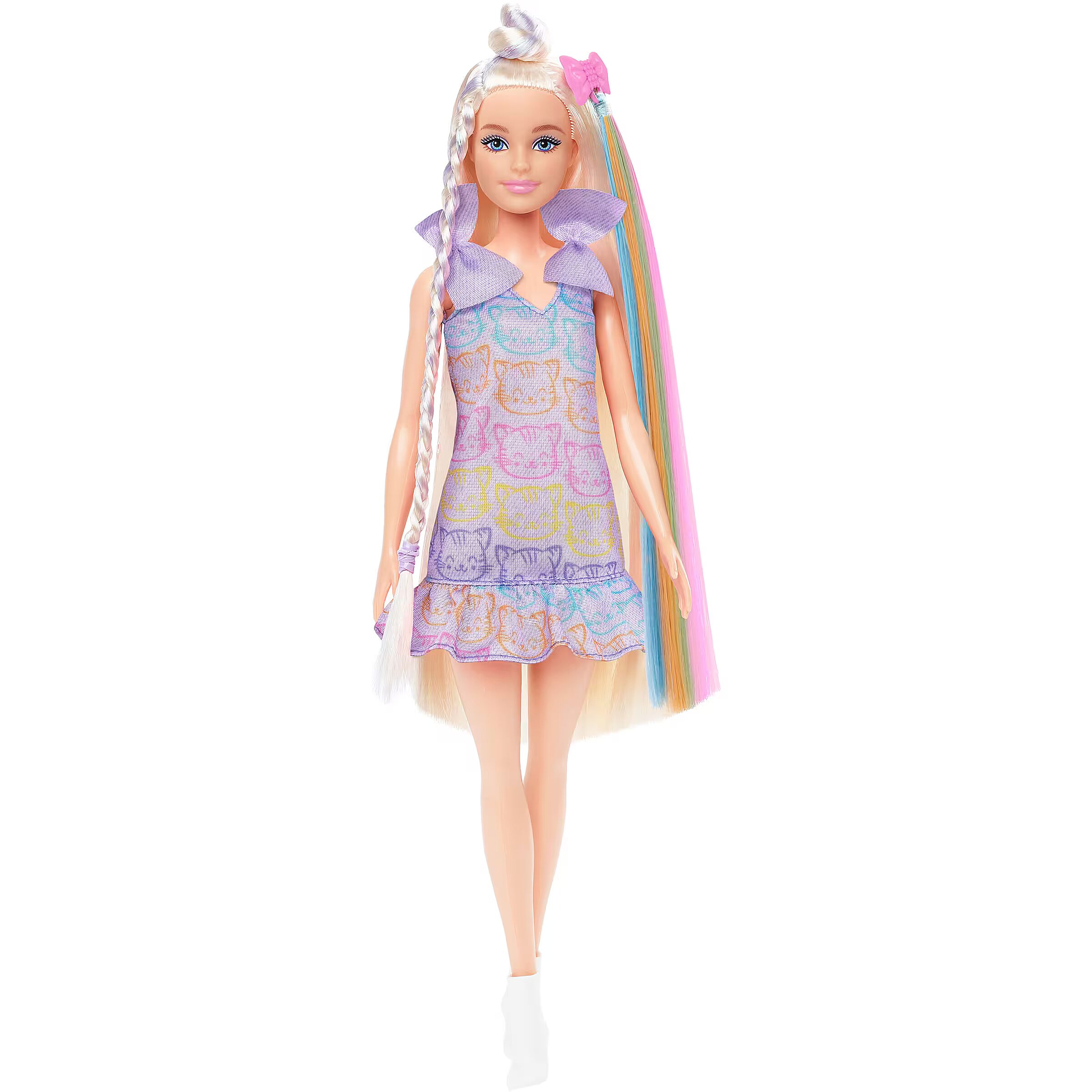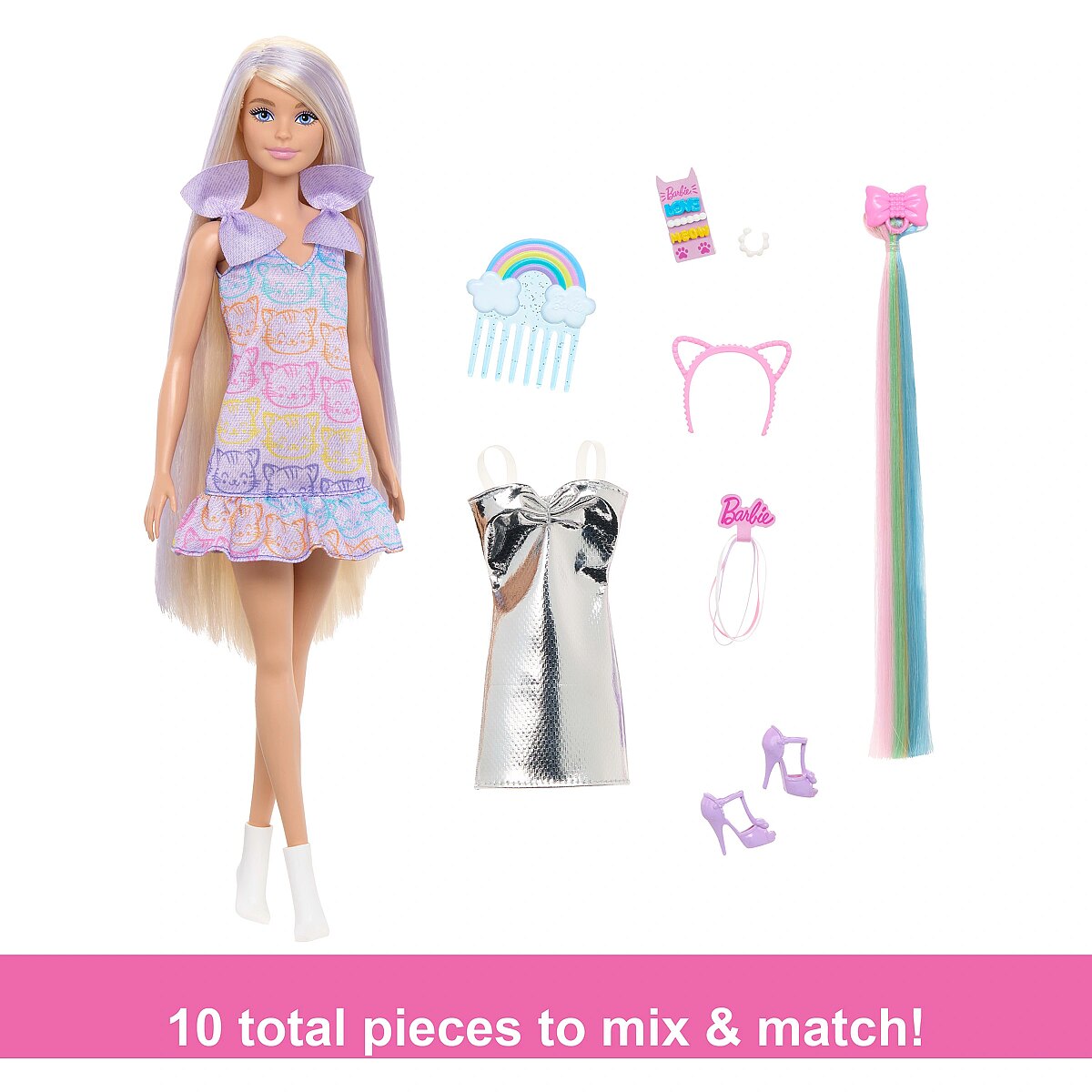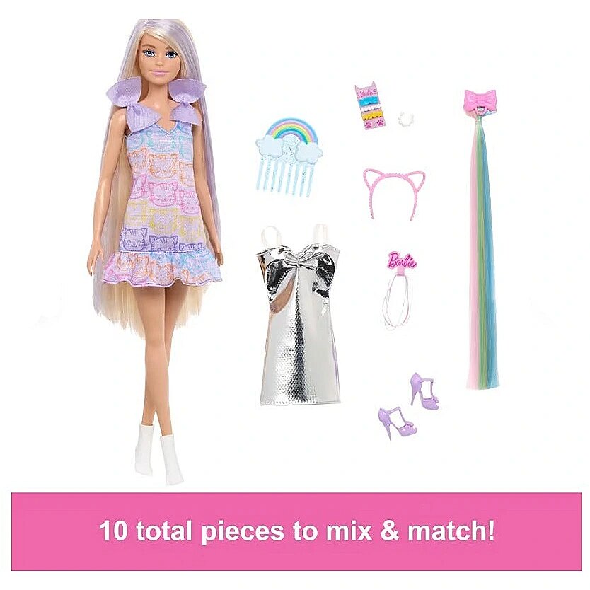 Description - The Barbie Fun & Fancy collection features cute dolls modeling colorful hairstyles and glam looks! Each doll has 8.5 inches of extra-long playable hair and includes 10 total fashion and styling accessories. Kids will love creating different hairstyles and exploring outfit possibilities! Each sold separately, subject to availability. Dolls cannot stand alone. Colors and decorations may vary. Devoted to all things hair, the Barbie Fun & Fancy Hair collection showcases glam dolls with colorful hairstyles -- plus, 10 included fashion and styling pieces for endless customization! Barbie doll has 8.5 inches of extra-long playable blonde hair with fantasy pops of color for extra-fun hairstyles! The fashion doll wears a colorful dress with cat print and big bows, accessorized with white boots. She comes with a second look for a style transformation -- a silver metallic dress and purple heels! Styling accessories include a clip with rainbow hair extension, cat ear headband, set of hair ties and one set of hair clips! Once kids have created their hairstyles, they can comb out Barbie doll's tresses and create a new look -- from colorful updos to layered braids, the possibilities are endless and hours of fun! Barbie Fun & Fancy hair dolls make a great gift for kids 3 years old and up, especially those who love exploring new looks, hairstyles and fashion!