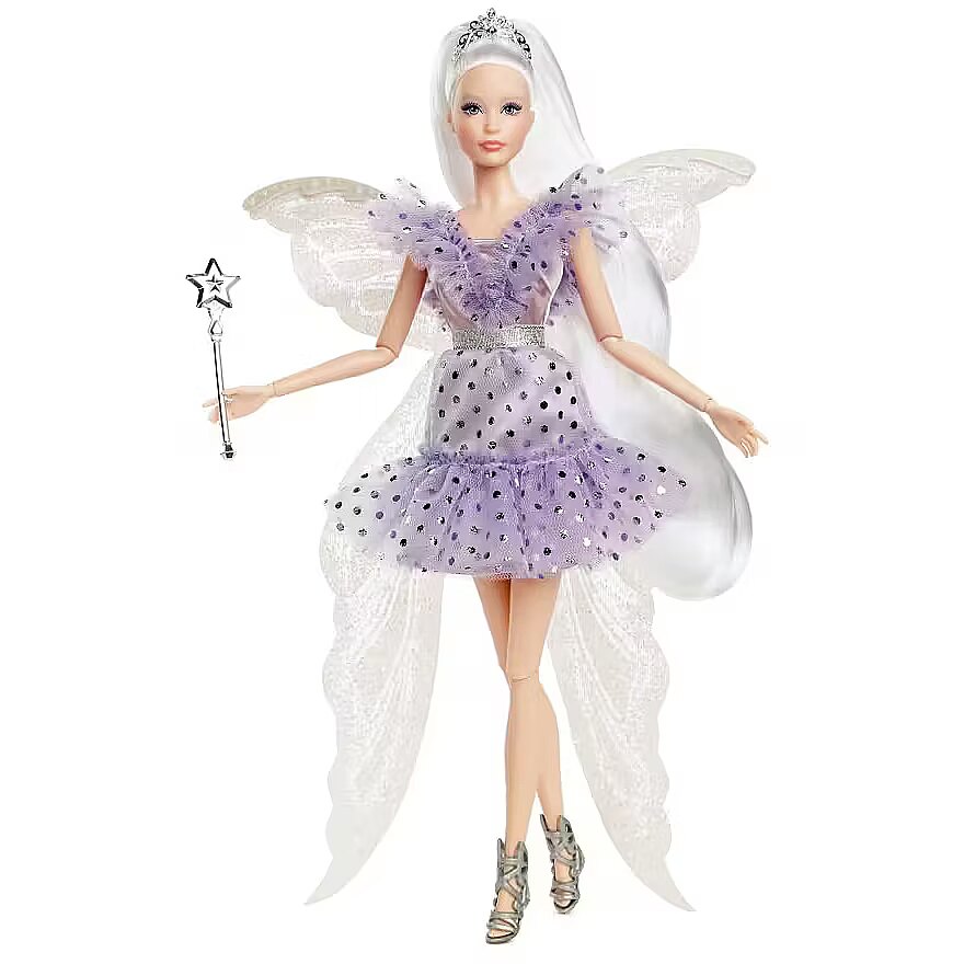 LongDesc - A visit from the tooth fairy is a magical milestone. This collectible Barbie doll commemorates the sweet moment with a fantastical look and accessories. Barbie Tooth Fairy doll wears a pretty, periwinkle dress featuring fluttery ruffles, sparkling polka dots and a beaded belt. Her look is complete with shimmery fairy wings, a silvery wand and a gemstone-encrusted tiara in her whimsical white hair. With a shimmering bag of silvery coins and packaging featuring space to write a personalized message, Barbie Tooth Fairy doll makes the perfect gift to celebrate such a special day. Includes doll stand and Certificate of Authenticity. Doll cannot stand alone. Colours and decorations may vary.