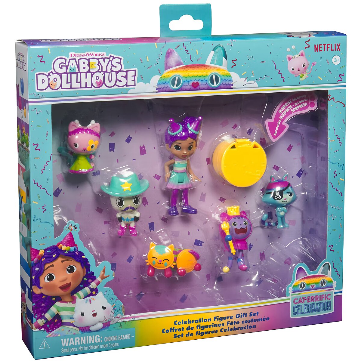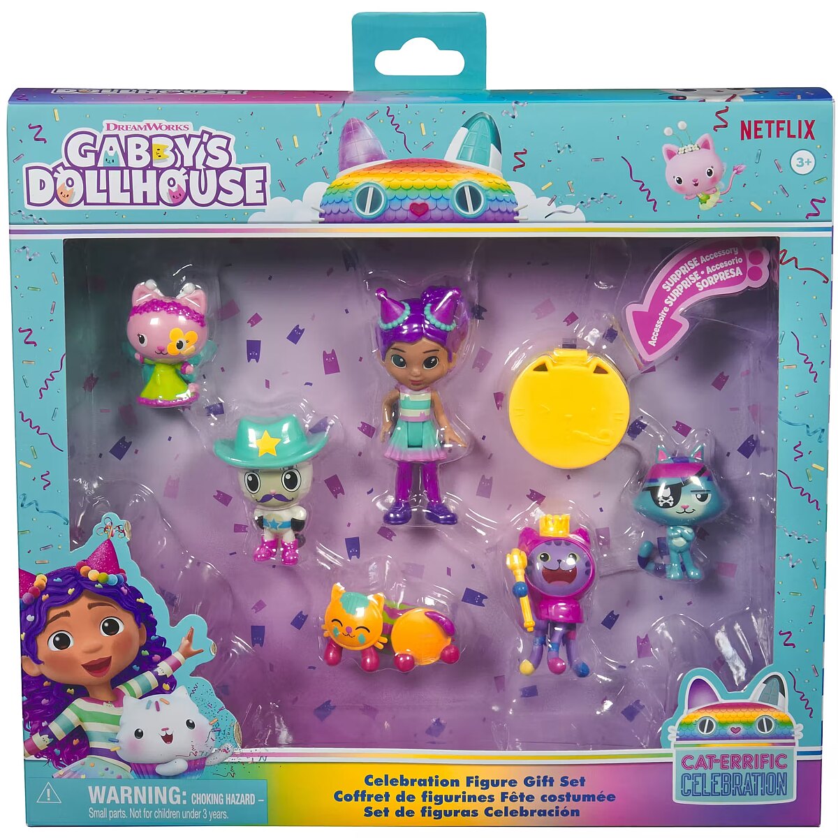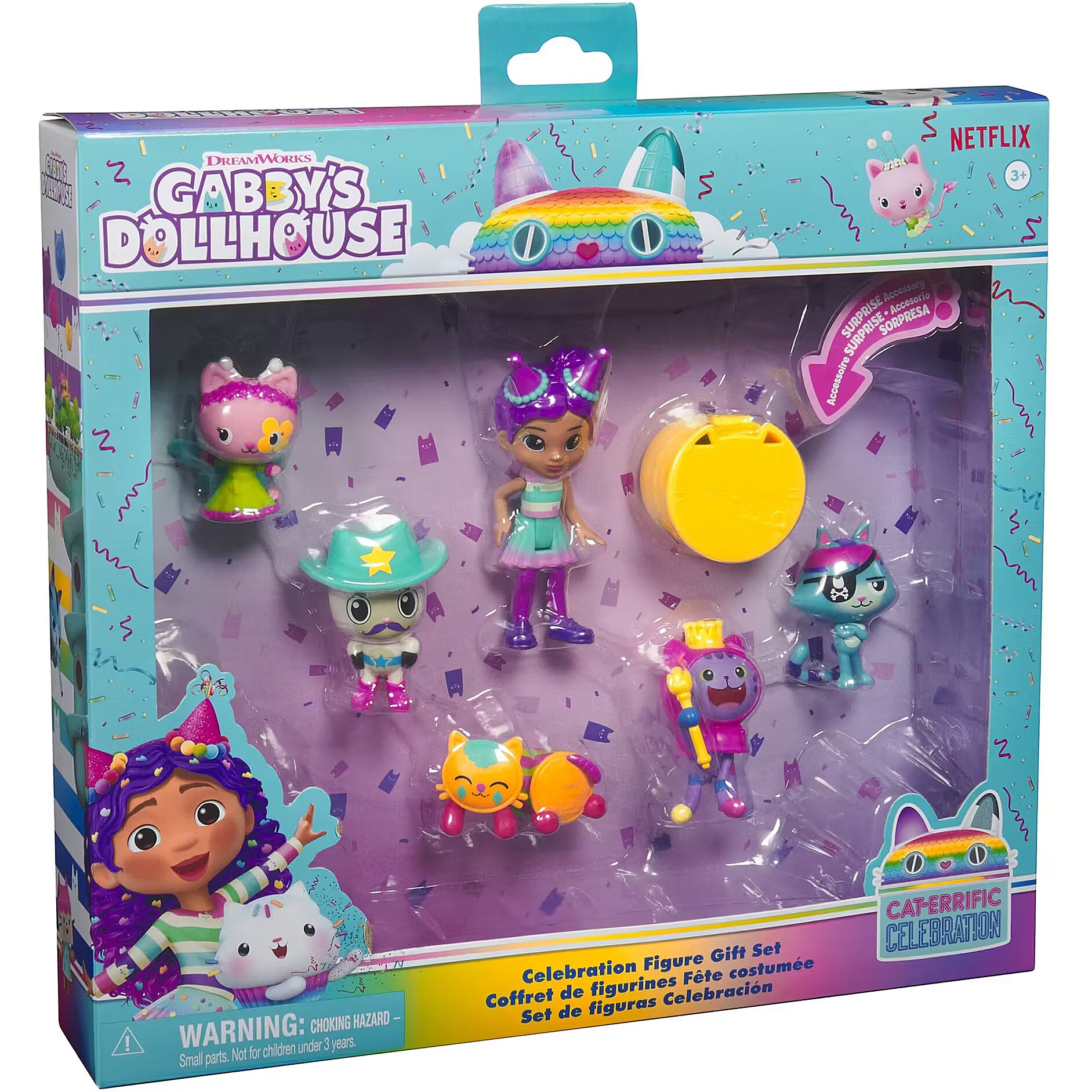 LongDesc - Step into the magical world of Gabby's Dollhouse with the Celebration Figure Gift Set! This exclusive figure set features Gabby and her favorite kitties like Pandy Paws, DJ Catnip, Catrat, Pillow Cat & Kitty Fairy! Then, unbox your very own dollhouse delivery to unveil the surprise toy, a delightful cape! For an added surprise, scan the QR code in the Dollhouse Delivery to unlock a special reward in the free Gabby’s Dollhouse App, available on iOS & Android. Gabby’s Dollhouse toys for girls & boys are great gifts for kids who are fans of the hit Netflix series and enjoy building pretend play doll house worlds. Make their entry into dollhouse play memorable with a world of lovable toy figures, dollhouse accessories and dollhouse furniture to collect and configure! Build your world with house kit essentials like a play kitchen or a music room, and tons of items to collect, like an awesome cruise ship toy, a mermaid themed pool and the all-new Party Room Playset - dollhouse attic with an indoor skate park, and super cute dollhouse balconies with mini fidget toys, that provide satisfying sensory play, and work seamlessly with both versions of the dollhouse!Includes: 1 Gabby Figure, 1 Pandy Paws Figure, 1 Catrat Figure, 1 DJ Catnip Figure, 1 Kitty Fairy Figure, 1 Pillow Cat, 1 Dollhouse Delivery, 1 Accessory