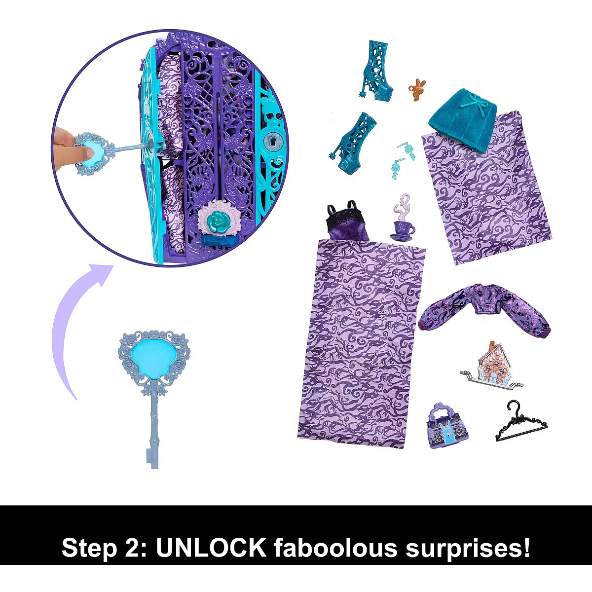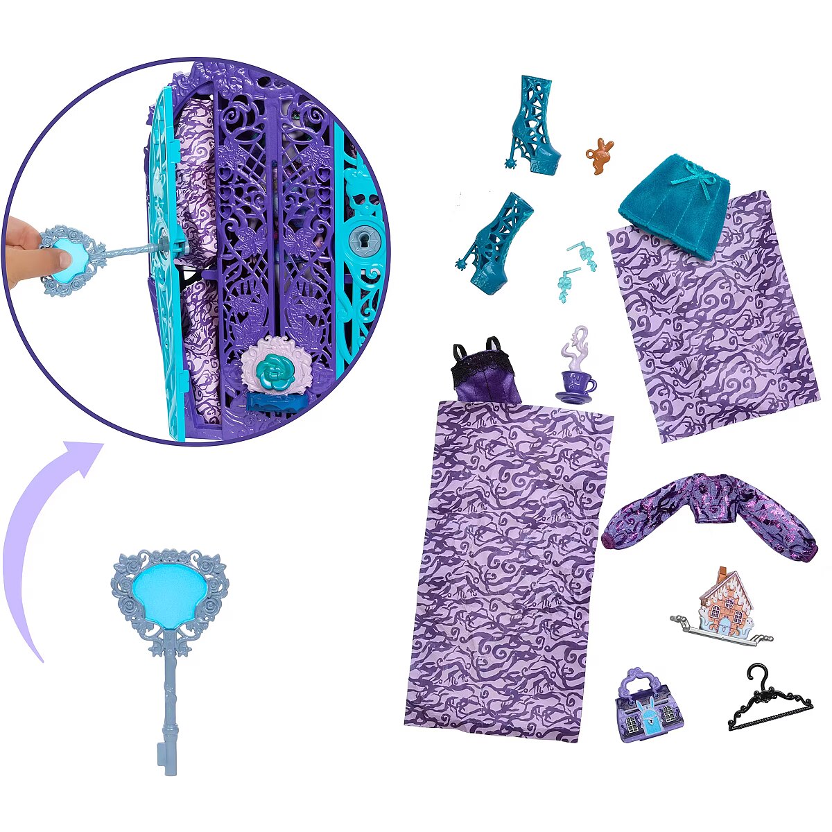 Accessories included - Lalka Monster High Szafa z dwojgiem drzwi Klucz 2 mapy 3 elementy do złożenia w talizman-klucz 2 wieszaki Ubranka i akcesoria dla lalki