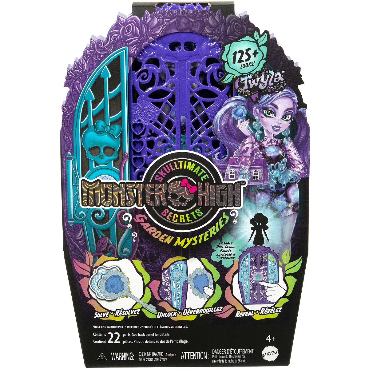 LongDesc - Solve the mystery, unlock the gates of Monster High, and reveal a Monster High doll with Skulltimate Secrets: Garden Mysteries! Kids can play spooky detective by searching for clues on the map with the 'magic' magnifying glass key. Along the way they'll discover 19+ suprises for an extraordin-eerie unboxing experience! Once playtime is over, kids ages 4 years old and up can stow the included doll, clothing, and accessories inside the creeperific closet, which is perfect for both storytelling and storage! Each sold separately, subject to availability. Fully articulated. Dolls cannot stand alone. Colours and decorations may vary.