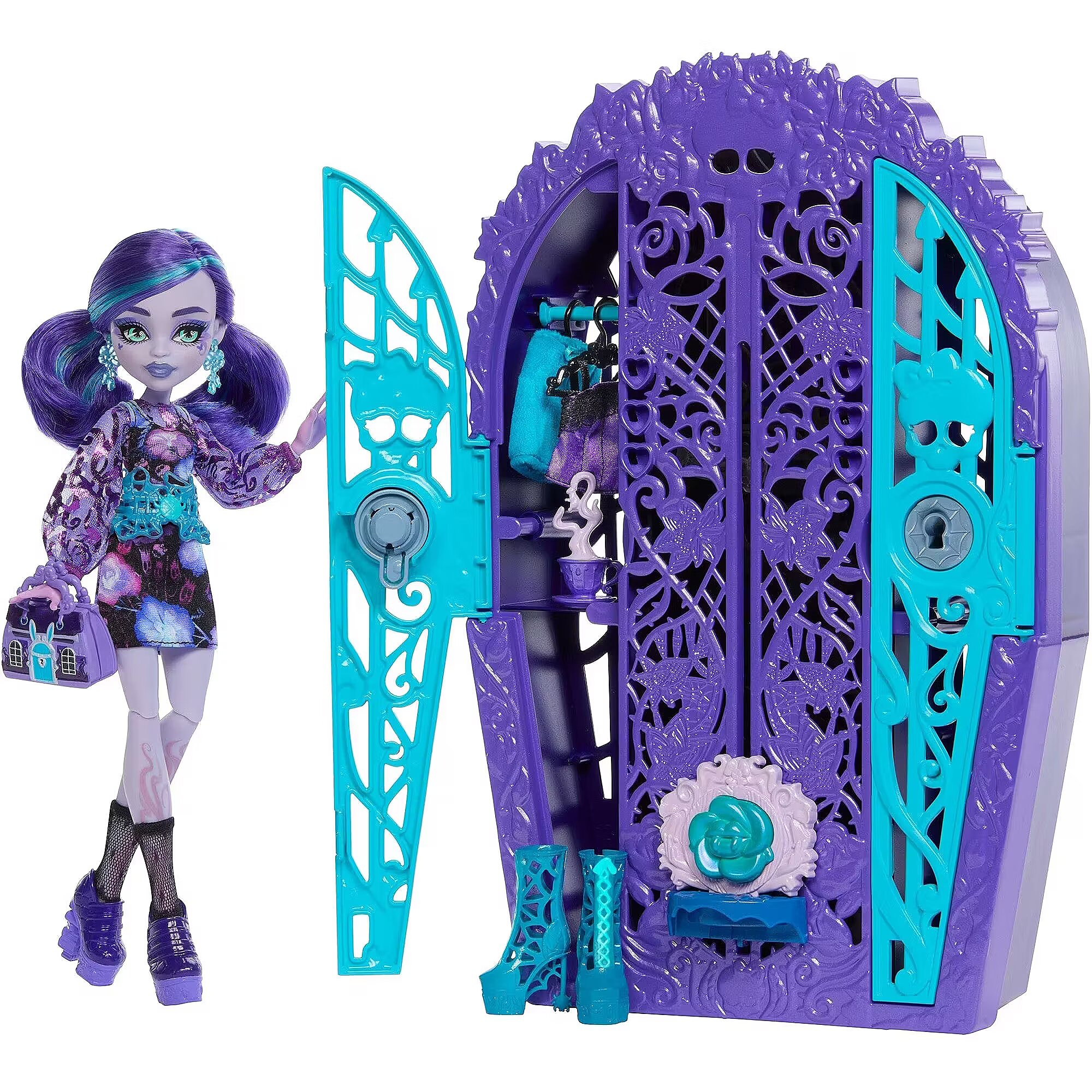 Packaging content - Packaging content - Includes 1 Twyla doll, 1 closet with two doors, 1 key, 2 maps, 3 charms, 2 hangers, and assorted clothing and accessories. Doll cannot stand alone. Colours and decorations may vary.