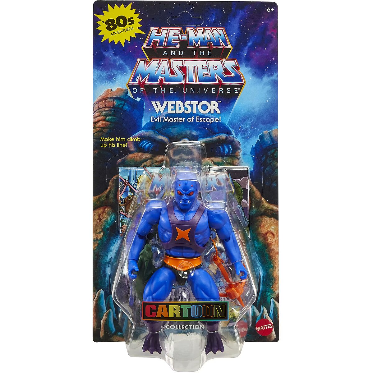 LongDesc - This MOTU Origins Webstor figure is inspired by the original cartoons from the '80s at 5.5-inch scale but with the modern posability provided by 16 articulated joints. This Masters of the Universe toy of the Evil Master of Escape can match poses from the 1980s content or make all new action moves. He has straighter legs and an overall more realistic build than his cartoon design. Webstor comes armed with a Grappling Hook and Grimalkin Statue. A mini comic is included to expand on his story. Makes a great gift for MOTU fans 6 years and older. Colours and decorations may vary.
