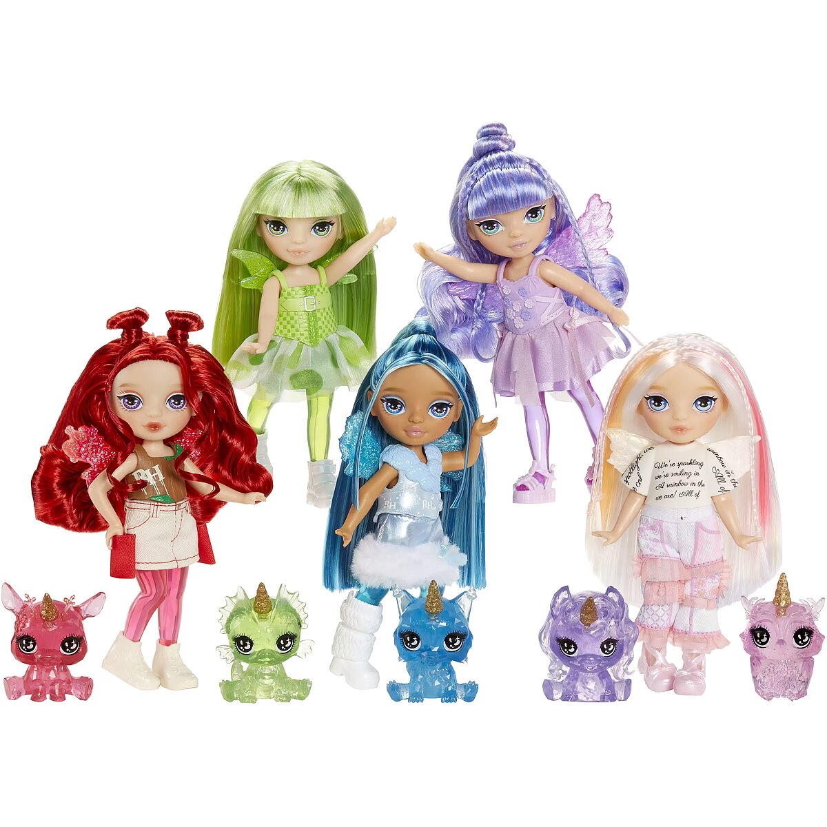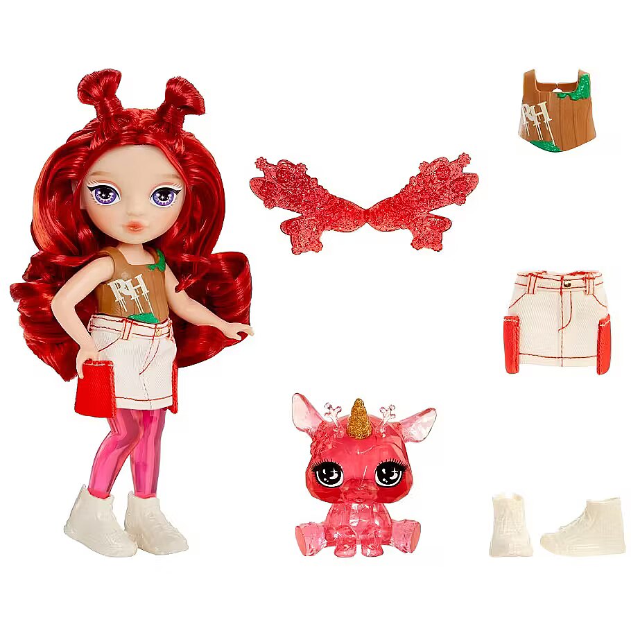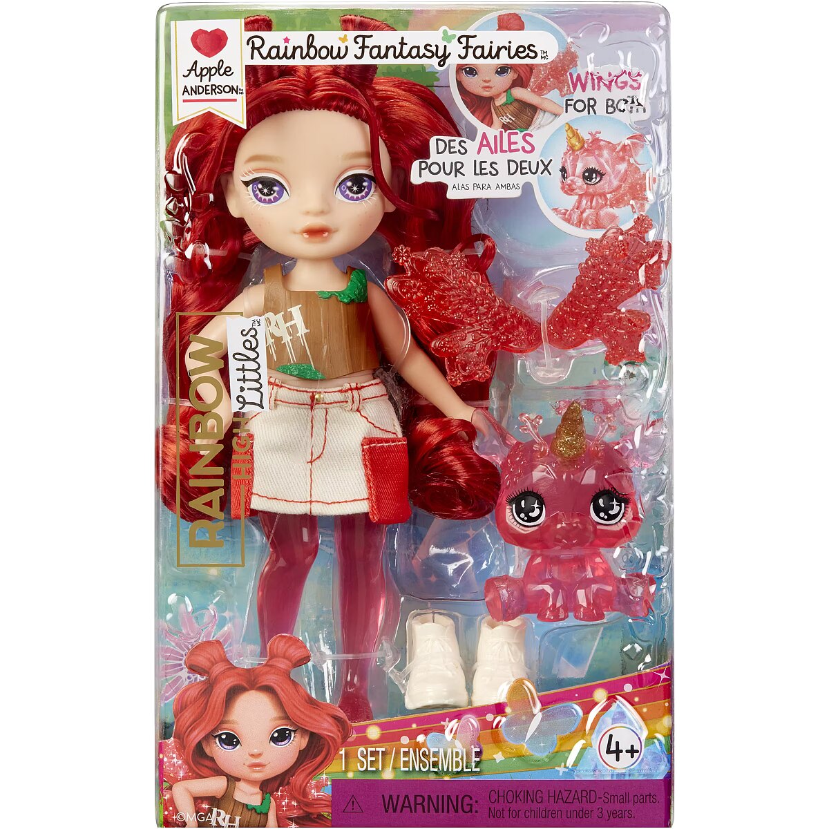 LongDesc - Rainbow High Littles are stepping into a magical world alongside their big sisters—and now, they have wings! These adorable Littles feature interchangeable fantasy fairy wings that can also be swapped with their enchanted pets. Each 5.5” poseable doll comes with a removable outfit, stylish shoes, brushable hair, and mesmerizing clear legs._x000D_Collect the rainbow: Astrid dazzles in rainbow with her Butterfly, Apple shines in red with her Deer, Emerald sparkles in green with her Dragon, Sapphire stuns in blue with her Dog, and Opal enchants in rainbow with her Owl.