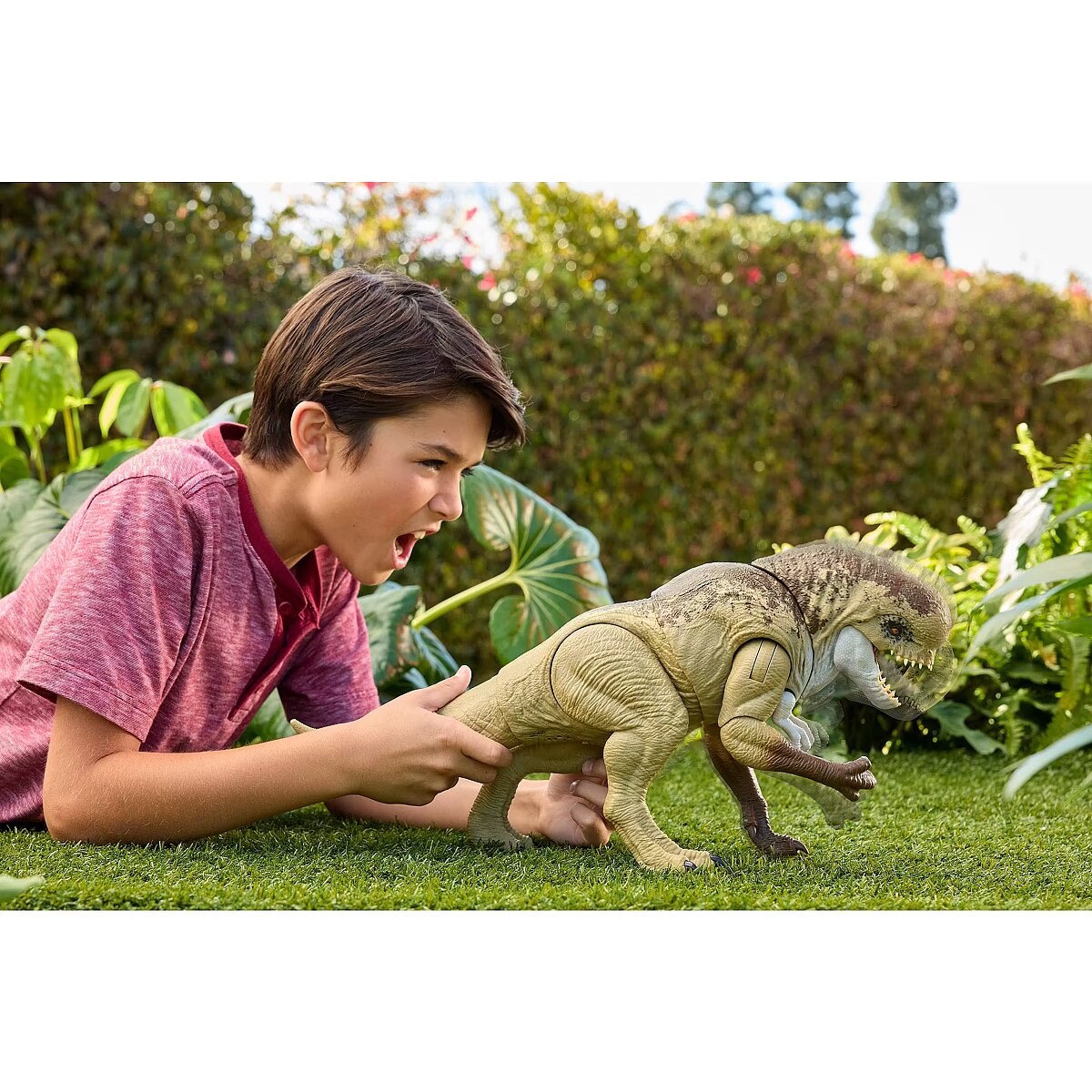 LongDesc - This authentic Distortus rex Rumble 'N Rampage action figure with its distinctive movie-accurate look brings the excitement of Jurassic World Rebirth home with an intimidating head rumble! This villain dinosaur from the movie also has dual motions, with a roar and chomp and a side-to-side upper body arm swipe -- it's a total attack! Movable joints and content-accurate design and deco make the Distortus rex ready for battle moves and poses. Scan the Tracking Code on the dinosaur's foot in the free Jurassic World Play App with a compatible smart device (Android or iOS, not included) to unlock a digital version of the dinosaur and play the fiercely fun game to race various vehicles on land, air and sea. Makes a great gift for dinosaur fans ages 4 years and up. Colours and decorations may vary.