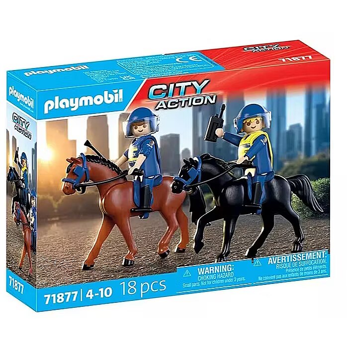 Description - Towarzysz dwójce policjantów podczas ich konnego patrolu przez miejską dżunglę i wspieraj ich w utrzymaniu prawa i porządku. Wyposażeni w sprzęt policyjny są gotowi do nagłych interwencji. Kopytka rozbrzmiewają w mieście - oto zestaw PLAYMOBIL: Konny patrol! Policjantka i policjant przemierzają ulice na swoich wiernych rumakach, gotowi do działania z radiem, latarką i zdejmowanymi kamizelkami. Konie są w pełni wyposażone w siodła i uzdy, a kaski funkcjonariuszy mają podnoszone osłony, które ułatwiają szybkie dowodzenie. Czy to w tłumie, czy w wąskich uliczkach - ten zestaw PLAYMOBIL to gwarancja emocjonujących przygód w mundurze. Idealny dla małych jeźdźców i przyszłych stróżów prawa!