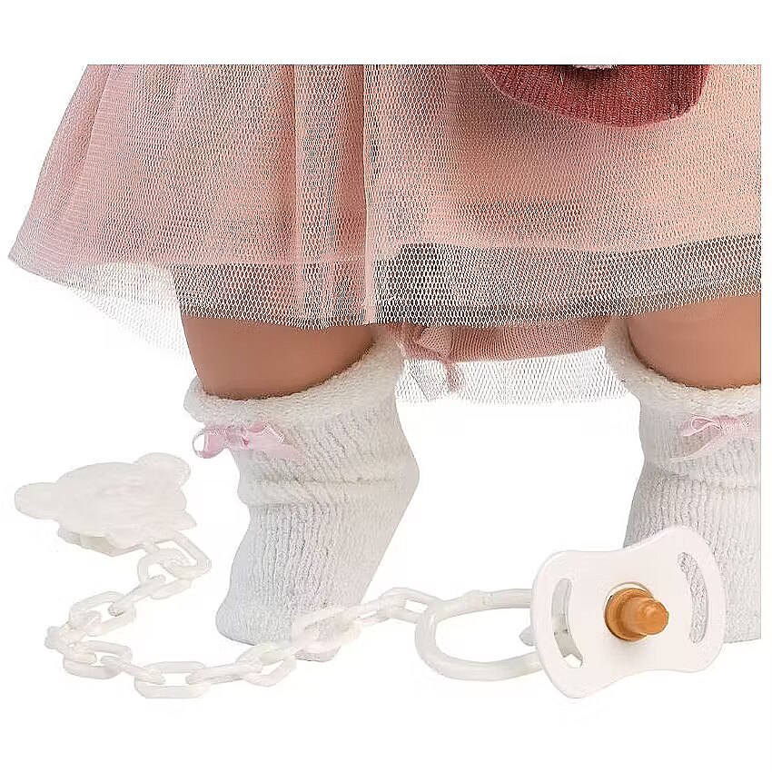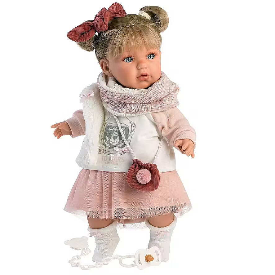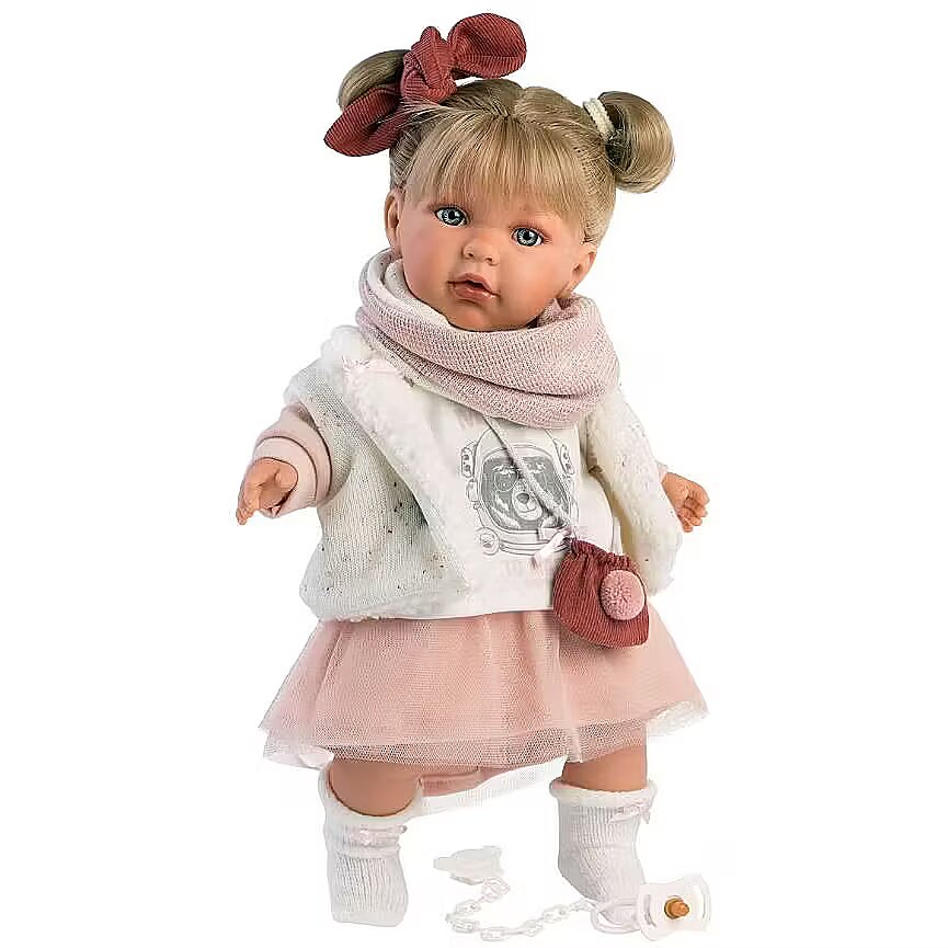 Description - W naszej manufakturze wierzymy, że zabawa jest najlepszą nauką. Dlatego też z wielką miłością tworzymy kultowe lalki Llorens, w 100% ręcznie wykonane, o niepowtarzalnych wzorach. Stosowane przez nas tkaniny pochodzą od renomowanych marek odzieży dziecięcej. Wszystkie lalki Llorens są zgodne z europejskimi przepisami dotyczącymi bezpieczeństwa dzieci, co gwarantuje, że Twoje dzieci będą się bawić w możliwie najbezpieczniejszy sposób. Lalka płacząca Julia mierzy 42 cm. Jej rączki, nóżki oraz głowa są wykonane z miękkiego w dotyku winylu, zaś brzuszek jest materiałowy. Lalka płaczę i woła mama, papa po wyjęciu smoczka. Julia ma śliczną urodę, duże niebieskie oczęta z długimi rzęsami, pełne usta oraz blond włoski z grzywką upięte w dwie kiteczki. Lalka jest ubrana w dwukolorową bluzę z nadrukiem, tiulową spódniczkę, futrzaną kamizelkę, białe skarpetki z kokardkami oraz różowy komin. Lalka została zapakowana w ozdobny karton, więc bez zbędnych dodatkowych opakowań, może być wręczona jako prezent. Kochamy hiszpańskie lalki Llorens!
