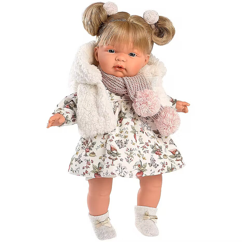 Description - Lalka Joelle 38 cm W naszej manufakturze wierzymy, że zabawa jest najlepszą nauką. Dlatego też z wielką miłością tworzymy kultowe lalki Llorens, w 100% ręcznie wykonane, o niepowtarzalnych wzorach. Stosowane przez nas tkaniny pochodzą od renomowanych marek odzieży dziecięcej. Wszystkie lalki Llorens są zgodne z europejskimi przepisami dotyczącymi bezpieczeństwa dzieci, co gwarantuje, że Twoje dzieci będą się bawić w możliwie najbezpieczniejszy sposób. Lalka płacząca Joelle 38 cm została ubrana w białą sukieneczkę, różowy szalik z pomponami, białe skarpetki i futrzaną kamizelkę. Jej blond włoski zostały uczesane w dwa urocze kucyki. Okrągła buźka, malutkie uszka, nosek i ustka sprawiają, że lalka wygląda jak prawdziwe dziecko. Jej ulubiony smoczek jest dla niej bardzo ważny, więc gdy go jej zabierzemy będzie płakać i wołać mama, papa. Lalka została zapakowana w ozdobny karton. Kochamy hiszpańskie lalki Llorens!
