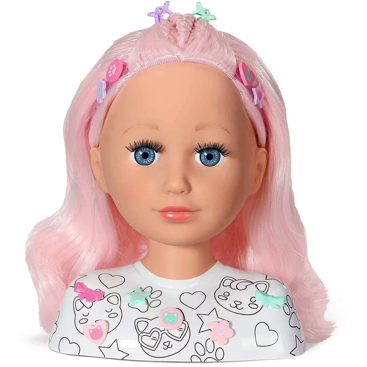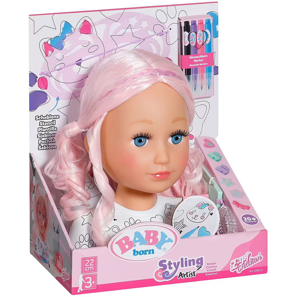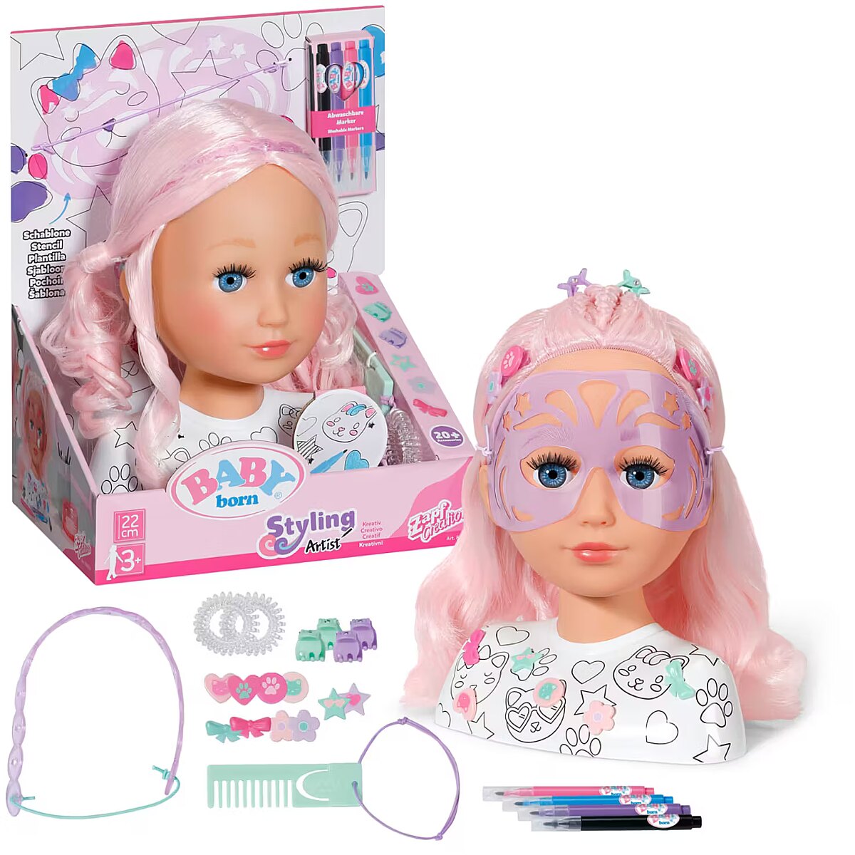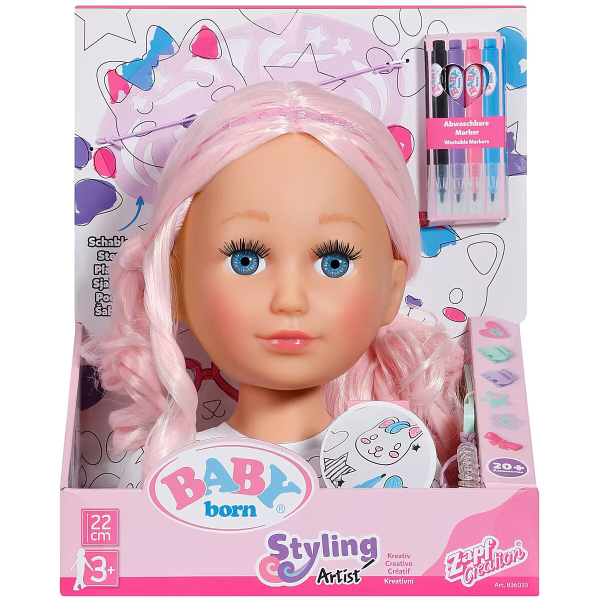 LongDesc - With the BABY born Creative Styling Head, there are no limits to imagination and creativity. The 22cm tall styling head can be made up and painted using the markers and stencil provided. But that's not all: the bust can also be painted with the colourful markers andpersonalised with 10 pastel-coloured The highlight is of course the long pink hair made of high-quality nylon. The coolest hairstyles can be conjured up with the matching accessories. The pins can also be used on the hair band.
