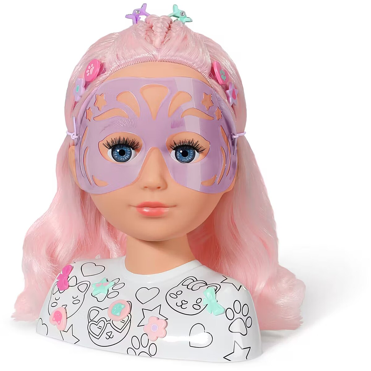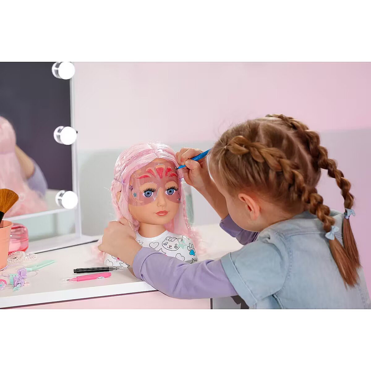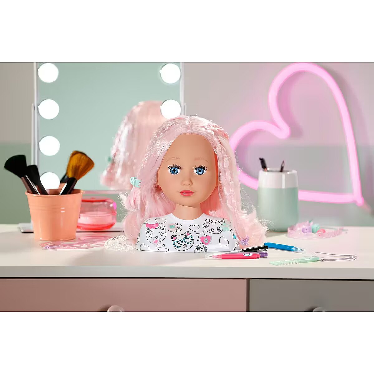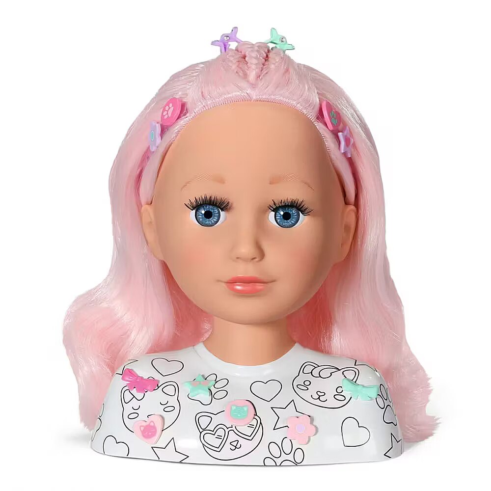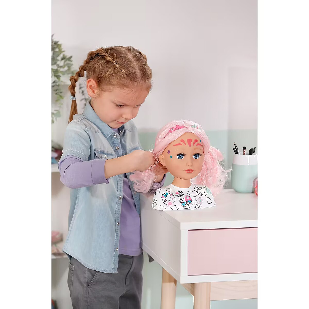 LongDesc - With the BABY born Creative Styling Head, there are no limits to imagination and creativity. The 22cm tall styling head can be made up and painted using the markers and stencil provided. But that's not all: the bust can also be painted with the colourful markers andpersonalised with 10 pastel-coloured The highlight is of course the long pink hair made of high-quality nylon. The coolest hairstyles can be conjured up with the matching accessories. The pins can also be used on the hair band.