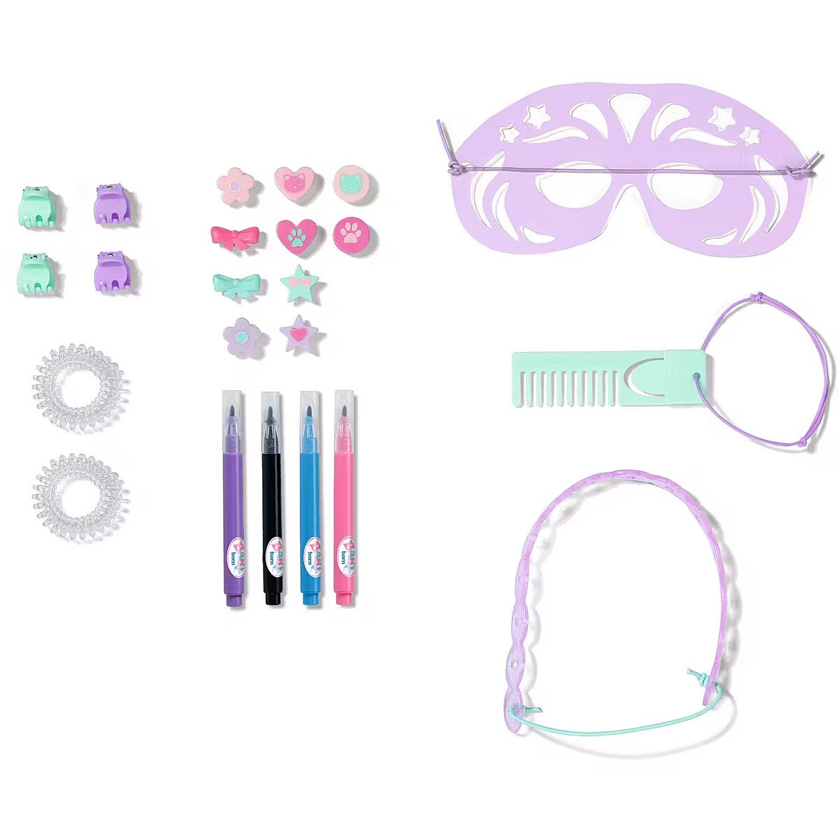 Accessories included - Głowa do stylizacji Kredki do makijażu 4 szablony Grzebień Opaska 4 spinki do włosów