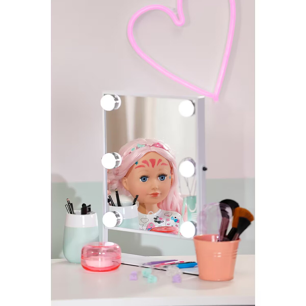 Description - BABY born Siostrzyczka - Głowa do stylizacji Nowy pomysł na zabawę w stylizację - makijaż i dekorowanie twarzy. Zawiera specjalne kredki do makijażu, szablony, grzebień, opaskę i spinki do włosów.