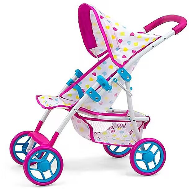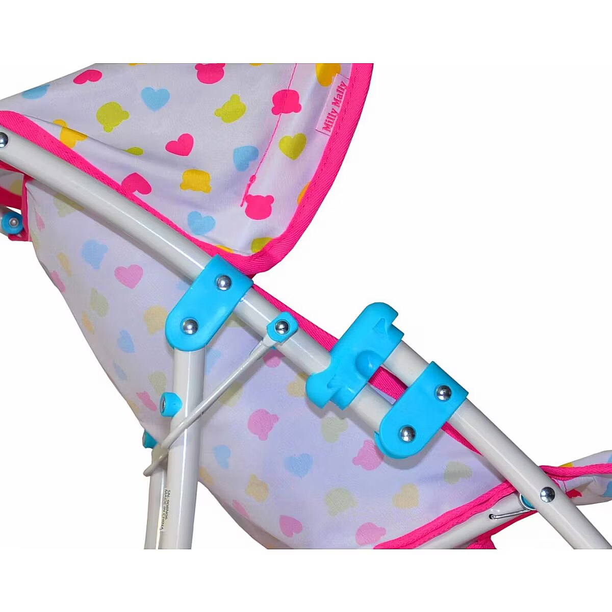 Description - Dolls pram Natalie Candy The Milal Mally Natalie doll pram is made of high quality materials. The functions and appearance of the doll stroller resembles a real pram. Natalie is a doll stroller up to 50 cm long. It is equipped with a folding booth, belts and swivel front wheels. In addition, it has a basket for doll accessories necessary during the walk, including bottles with milk, clothes and nappies. Main features: