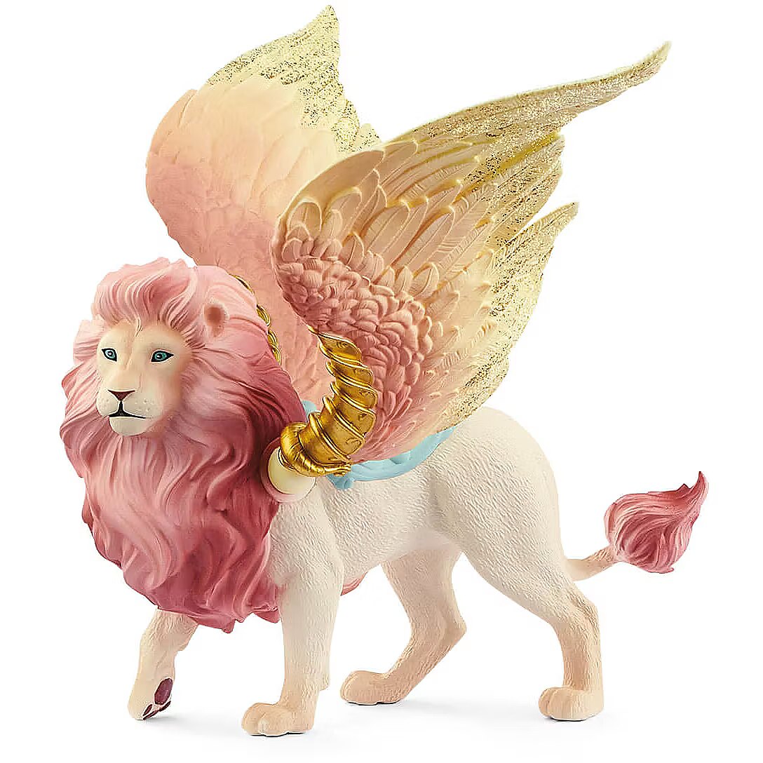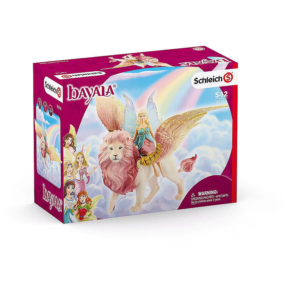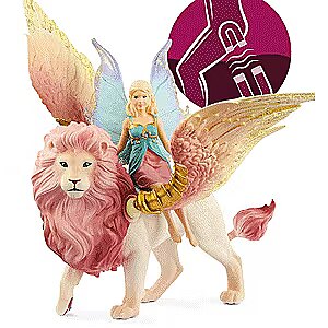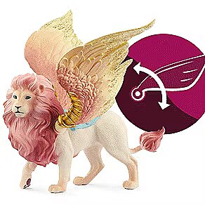 LongDesc - Imagination and storytelling spring to life with the Fairy in Flight on Winged Lion, from schleich®. Explore the magical world of BAYALA® with this 2-piece set featuring a majestic winged lion toy and a richly painted fairy figurine. A built-in magnet keeps the fairy seated on the lion while in flight. This set also plays nicely with our other magical toys, like the Winged Baby Lion Training.The winged lion and her fairy rider soar gracefully above BAYALA®, the pinks and golds and blues of the flower meadows below mirrored in the fairy's wings and the lion's mane. Their friends await as they climb toward the clouds, swooping higher! The modeling and paint work showcase schleich®'s unmatched attention to detail. The lion's movable wings feature intricate coloring and a 12" wingspan for swift transport wherever your story leads you. The wings are easily popped into sockets on the lion's torso and move back and forth. The fairy has a built-in magnet that helps her stay on the lion's back. The Fairy in Flight toy is a part of schleich®'s BAYALA® collection of fairies, mermaids, unicorns and other enchanted creatures.The enchanted figurines and playsets of schleich® BAYALA® introduce the limitless possibilities of storytelling and imaginative play. From majestic owls and woodland elves to glittering flower houses and unicorn stables, schleich® BAYALA® lets your stories run wild. Mythical creature figurines twinkle in rich detail, while authentic playsets enrich every tale! Our fairy toy figurines love to be whisked away into stories featuring schleich® dinosaur toys, wild animal figures and toy horses! schleich® mythical creature toys and playsets are built to last for generations. All our toys meet the highest national, international, and enchanted kingdom safety standards.