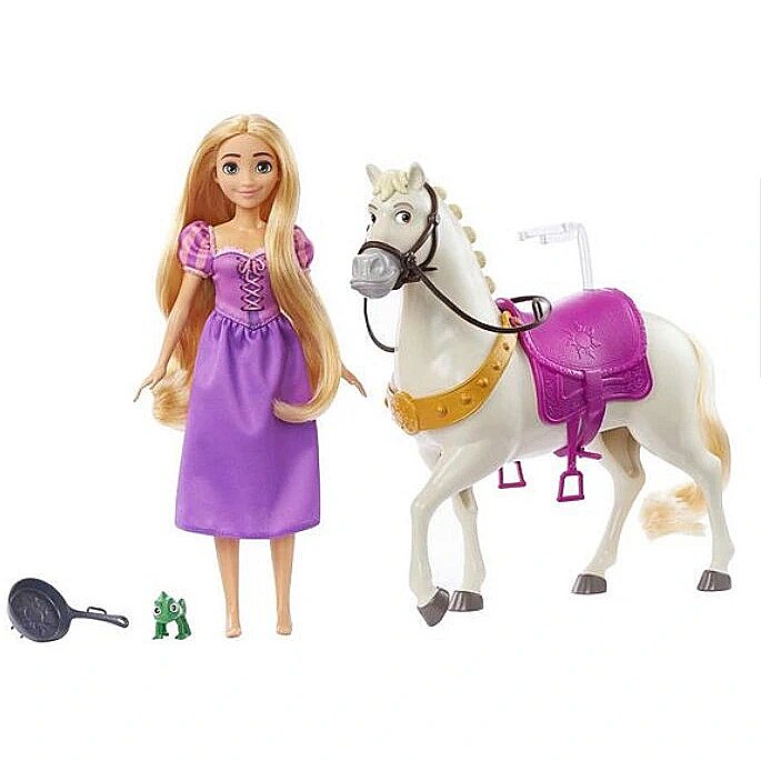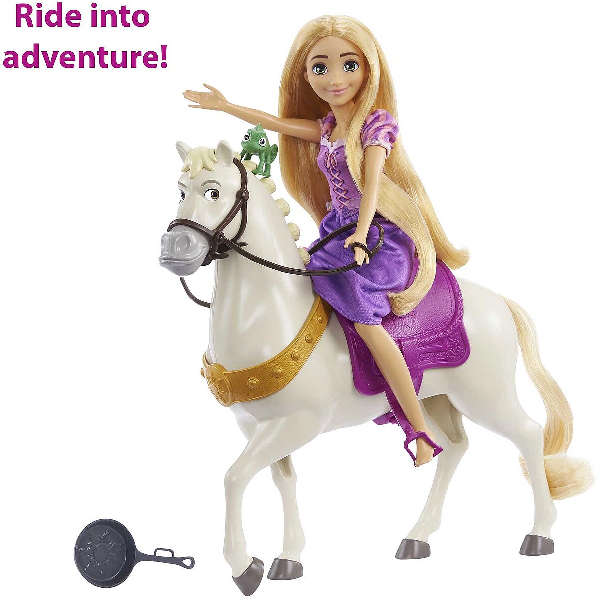 Description - This Rapunzel doll, inspired by the vibrant and creative princess from Disney's Tangled, is ready for adventure with her devoted horse Maximus! With a saddle and bridle for Maximus, and bendable knees on Rapunzel doll, the two are ready to ride around the kingdom together. Pascal figure can be clipped onto Maximus's mane or Rapunzel's arm and join in the fun, too. Doll cannot stand alone. Colors and decorations may vary.