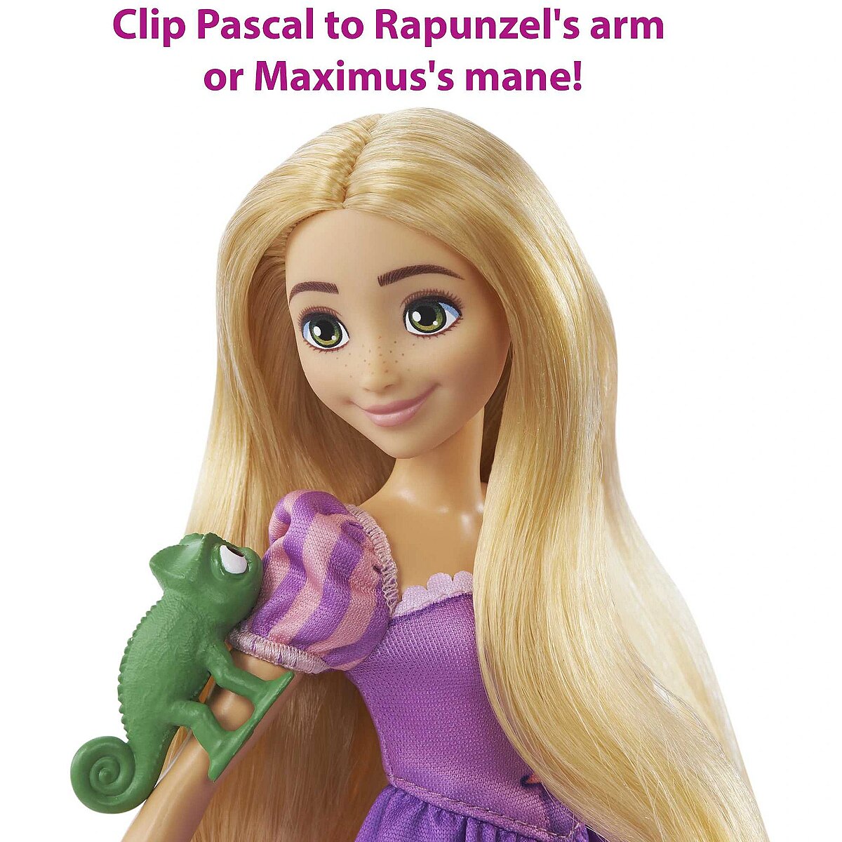 LongDesc - This Rapunzel doll, inspired by the vibrant and creative princess from Disney's Tangled, is ready for adventure with her devoted horse Maximus! With a saddle and bridle for Maximus, and bendable knees on Rapunzel doll, the two are ready to ride around the kingdom together. Pascal figure can be clipped onto Maximus's mane or Rapunzel's arm and join in the fun, too. Doll cannot stand alone. Colours and decorations may vary.