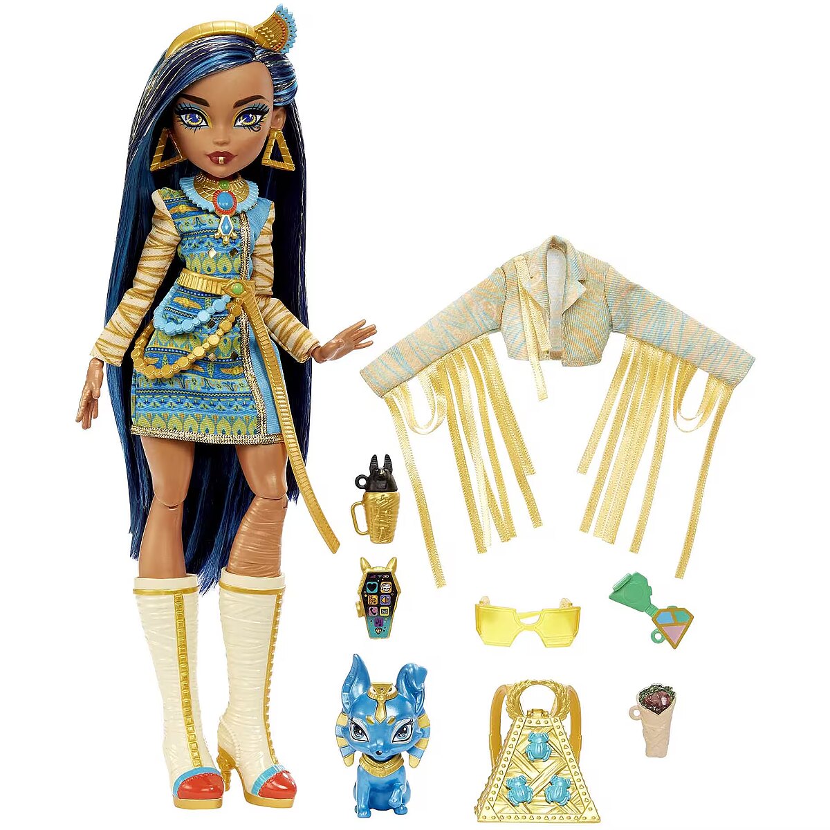 Accessories included - Monster High Cleo De Nile doll with clothes, shoes and accessories Animal figurine Backpack "Burrito" "Drink" "Smartphone" Makeup palette Extra jacket