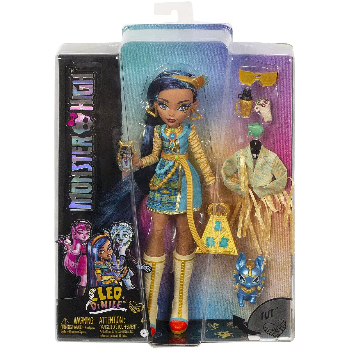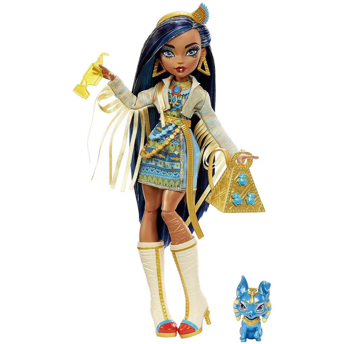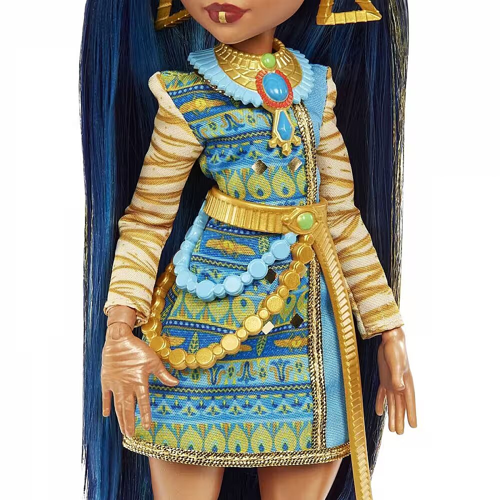 Description - School is back in session, and the Monster High ghouls are showing up in scream-tastic style! Cleo De Nile doll struts down the Monster High hallways in a fashion inspired by her royal scaritage, featuring a royal blue dress with mummy wrap-inspired sleeves and a gore-geous chain belt. Her scary-chic look is complete with knee-high boots, a pyramid-shaped scarab-studded backpack and glam, golden accessories. Take Cleo De Nile dolls look to the next level with a freaky-fabulous fringe jacket and accessories. And inspire spooktacular storytelling with her creepy-cute pet puppy, Tut! Doll cannot stand alone. Colors and decorations may vary. School is back in session, and the Monster High ghouls are strutting the hallways in scream-tastic style! Cleo De Nile doll wears a royally cool fashion featuring a blue and golden dress with mummy wrap-inspired sleeves and a scary-chic chain belt. Gore-geous details include killer knee-high boots, a creepy-cool collar necklace, matching earrings and glam sunglasses. Take Cleo De Nile doll's look to the next level with a freaky-fabulous fringe jacket and freaky-fab accessories, like a scarab beetle-studded pyramid backpack, burrito snack, beverage, smartphone and makeup compact. Inspire spooktacular storytelling with her creepy-cute pet pup, Tut! With flexibility at the torso, elbows, wrists and knees, fans can capture Cleo De Nile doll in all kinds of monsteriffic poses. Kids ages 3 years old and up can collect the other Monster High ghouls to play out their stories with the whole creeptastic crew! Each sold separately, subject to availability.