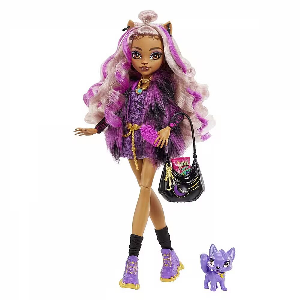LongDesc - School is back in session, and the Monster High ghouls are showing up in scream-tastic style! Clawdeen Wolf doll struts down the Monster High hallways in a clawsome fashion featuring an animal-print jumper and long-sleeve top with crescent moon print. Her freaky-fabulous, werewolf-inspired look is complete with creeperific sneakers, a black purse and glam, golden glasses and jewelry. Take Clawdeen Wolf doll's look to the next level with a fierce, faux-fur vest and scary-chic accessories. And inspire spooktacular storytelling with her creepy-cute pet dog, Crescent! Doll cannot stand alone. Colours and decorations may vary.