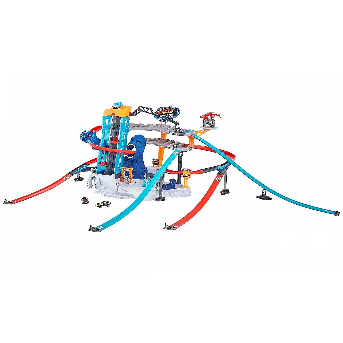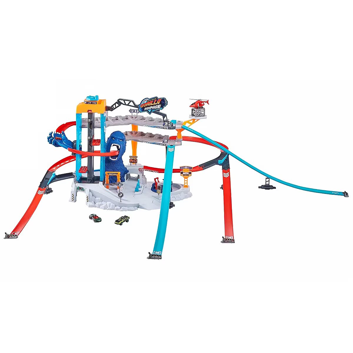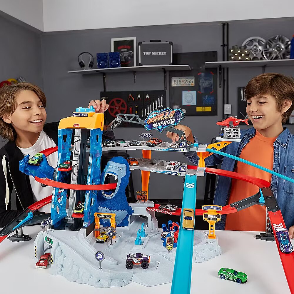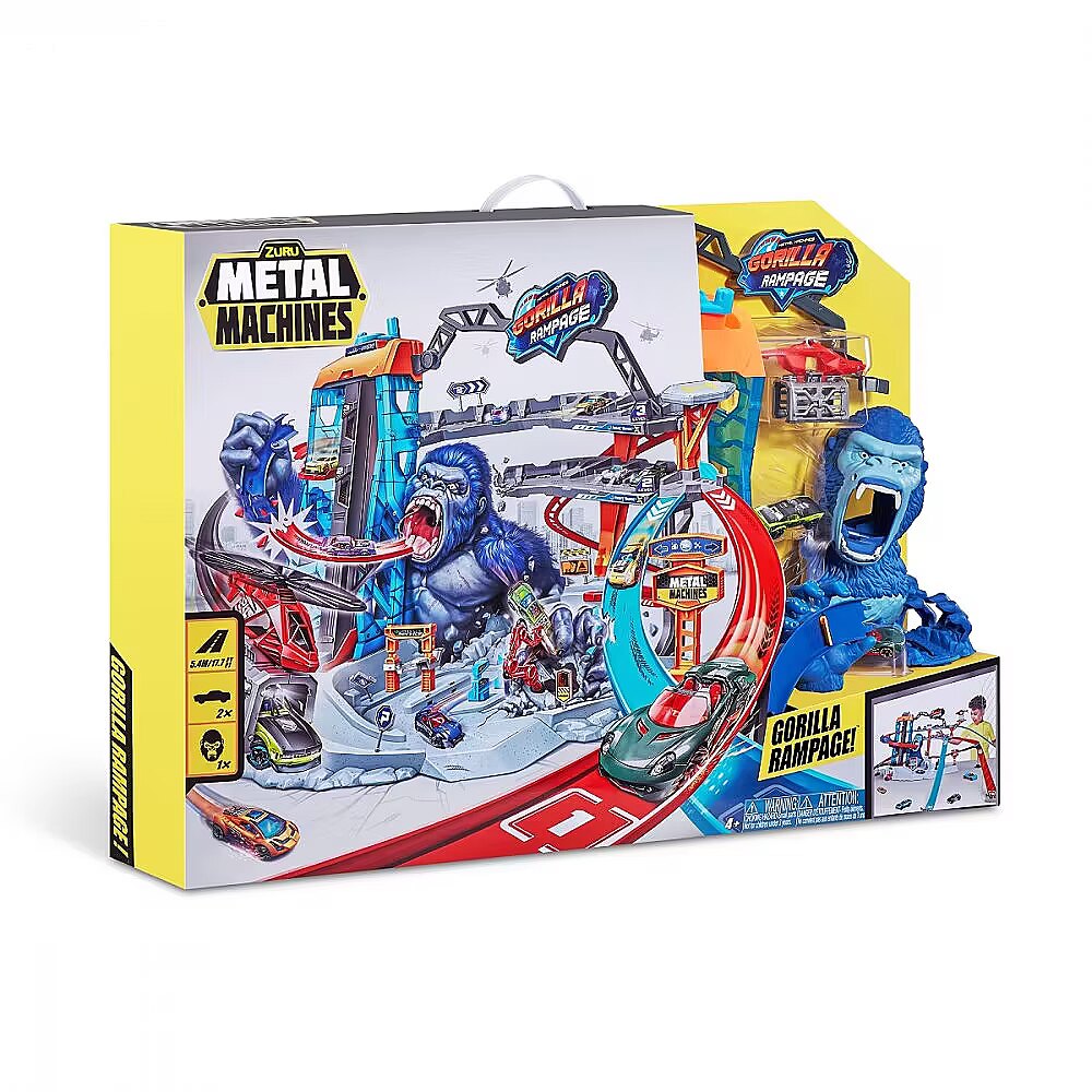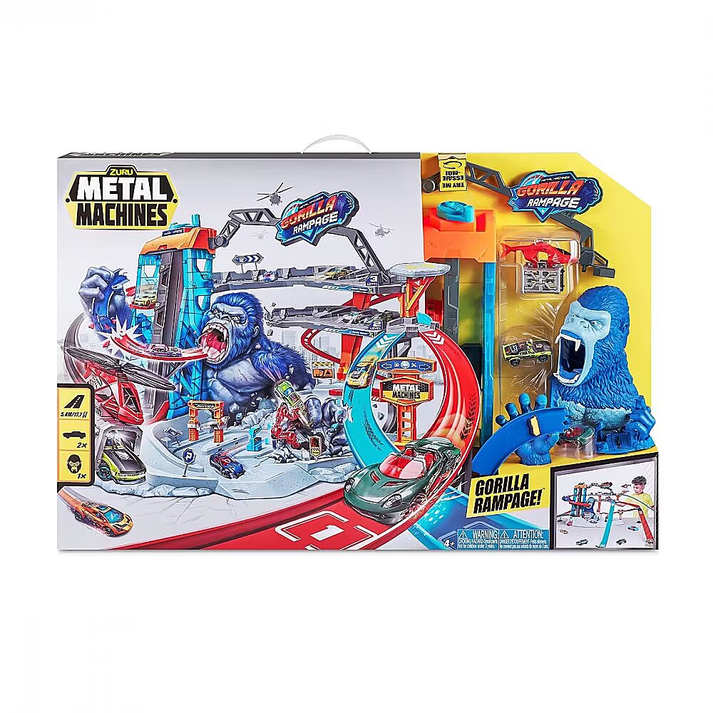 Description - ZURU Metal Machines Garage Gorilla Attack Get ready for Gorilla Attack in the biggest set of ZURU Metal Machines! This multi-level structure will push your colourful cars to the limit and give you a solid dose of adrenaline. Parking and parking spaces await you on two levels in a garage that holds up to 20 vehicles, as well as a lift for two cars! The Metal Machines Gorilla Rampage car track is also equipped with 2 car repair stations and a platform for a rescue helicopter to transport your vehicles. Above these attractions, however, lurks a powerful gorilla who is ready to attack at any moment! Will you be able to tear through his huge maw and escape unharmed? Gorilla Attack is the ultimate Metal Machines car set, with twisting tracks that take you straight into the jaws of the fierce beast! Take advantage of the multi-level car park with spaces for up to 20 vehicles and look after your cars at the two repair stations! Transport your cars using the two-car lift or the helicopter with its own landing platform. When the action picks up, dodge the beast through an underground tunnel to avoid its jaws! Most track pieces and sets are interchangeable - change the directions of your tracks and create new combinations for even more fun! 2 Metal Machines cars included.