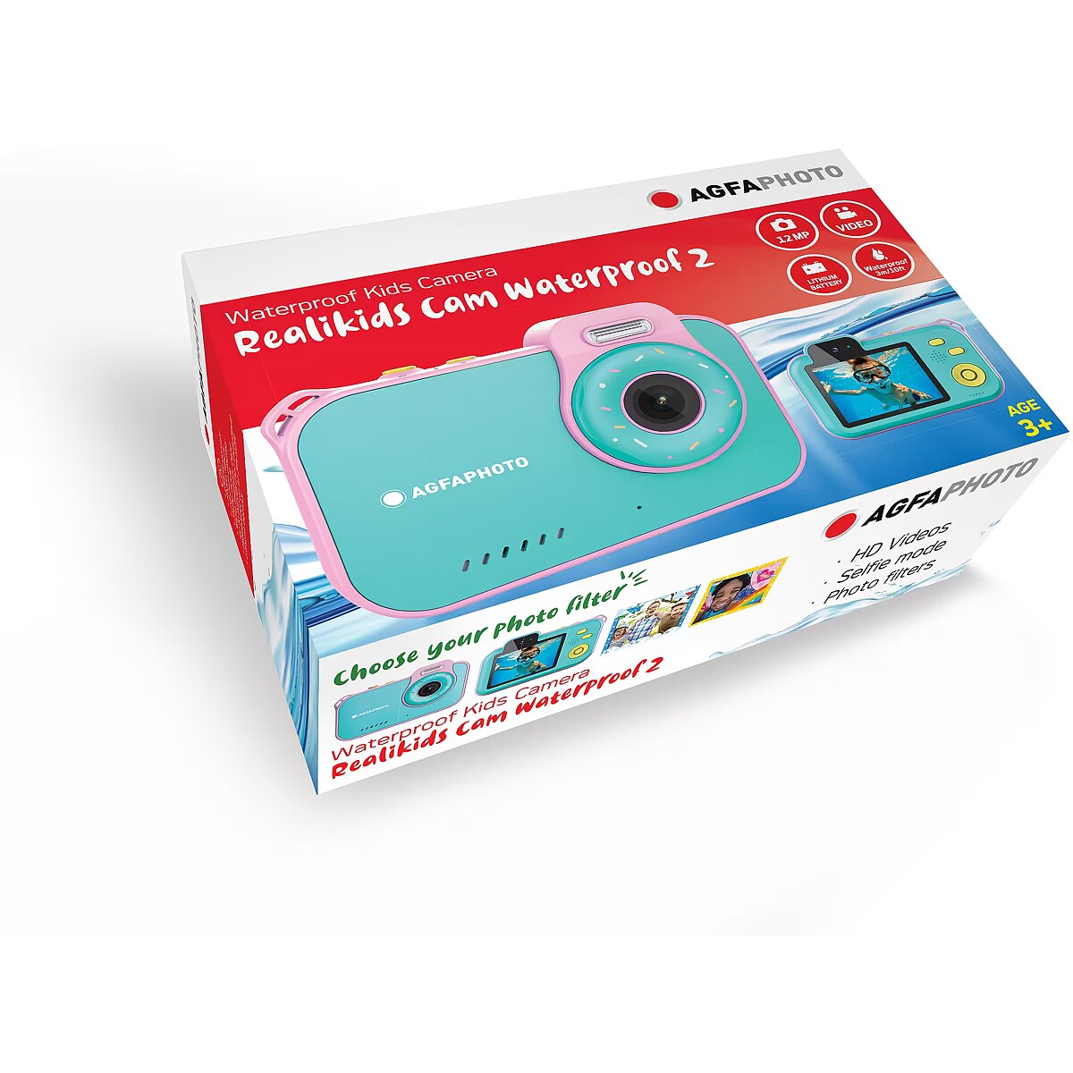 The Realikids Cam Waterproof 2 camera and video for children from AgfaPhoto is the ideal tool for capturing every moment of life while braving the bad weather and shocks of their daily lives. Easy to use, it can take 12MP photos and 2.7K videos, while featuring fun effects and a selfie mode! Compact and colourful, it has a fun shape and will be the perfect companion for children who want to develop their creativity, both on land and underwater, thanks to its waterproofing to 3m. The new fun, waterproof and creative camera