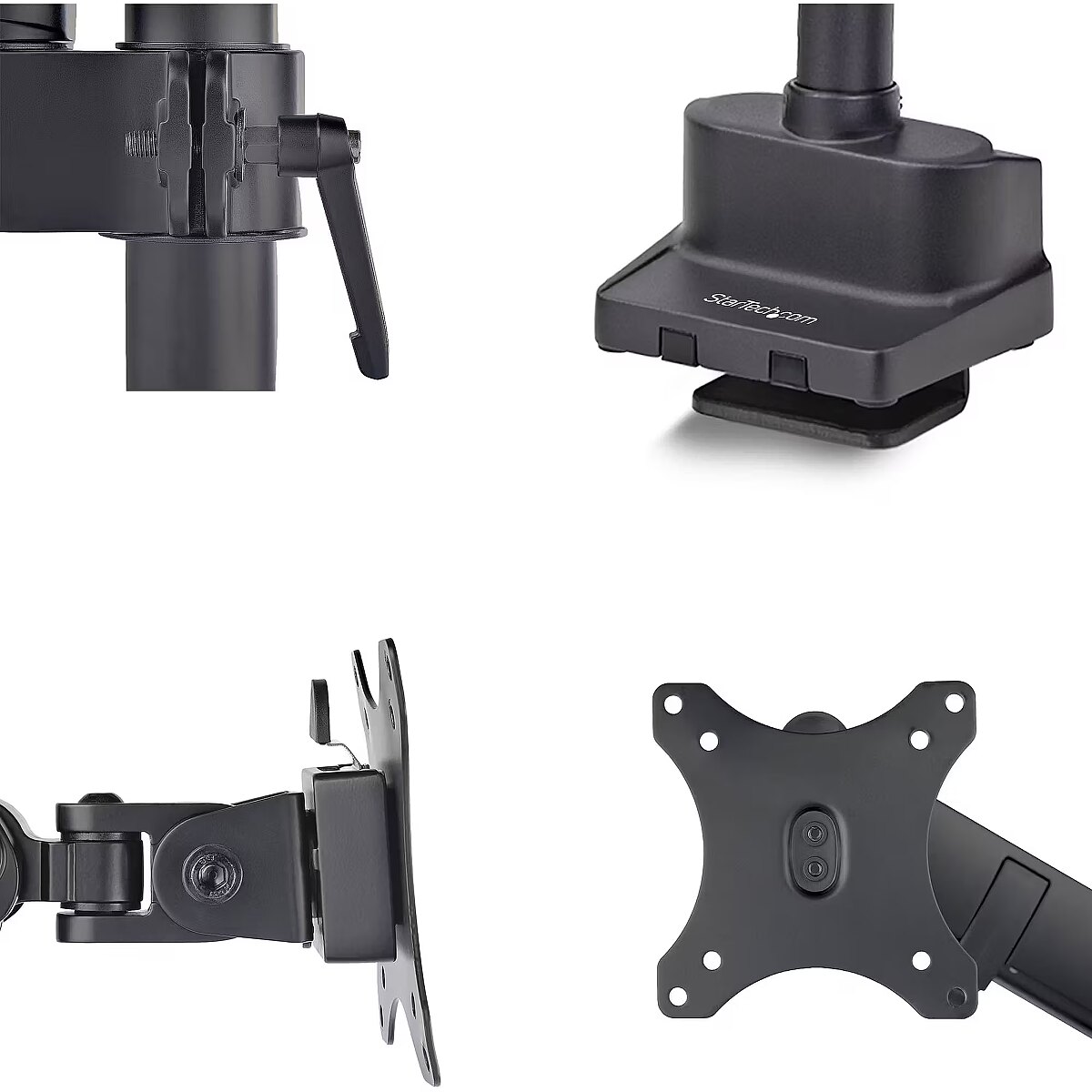 LongSummaryDescription - StarTech.com Desk Mount Monitor Arm, Up to 40-inch Screen/17.6lb (8kg), Mechanical Spring-Assisted Arm, C-Clamp/Grommet, Top-Down Installation, Toolless Adjustment. Maximum weight capacity: 8 kg, Minimum screen size: 43.2 cm (17"), Maximum screen size: 101.6 cm (40"), Minimum VESA mount: 75 x 75 mm, Maximum VESA mount: 100 x 100 mm. Height adjustment, Swivel angle range: -180 - 180°, Tilt angle range: -90 - 90°. Product colour: Black