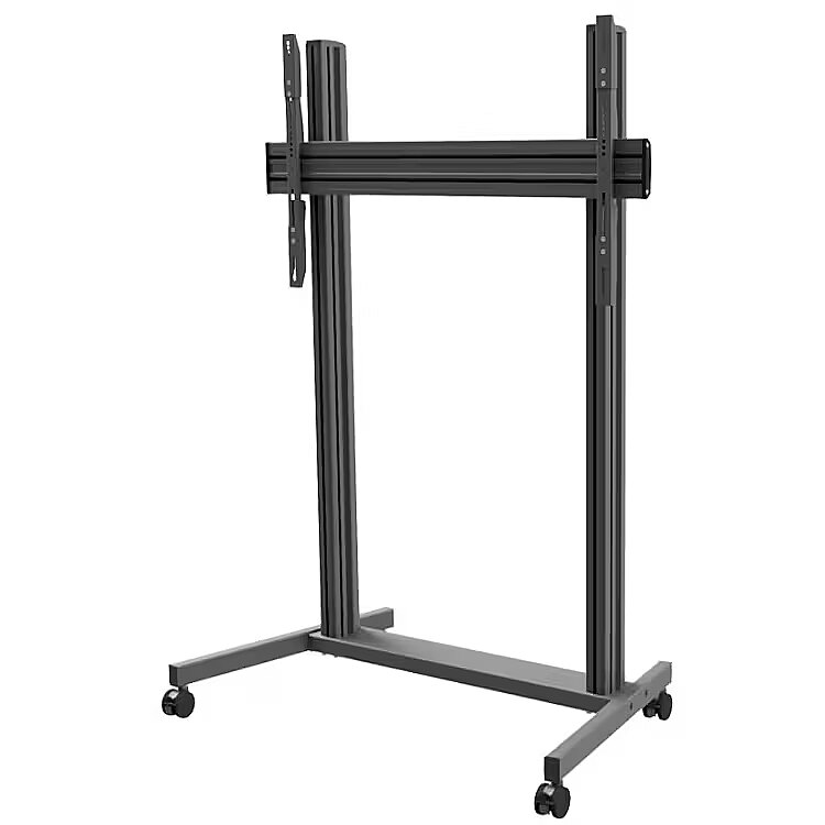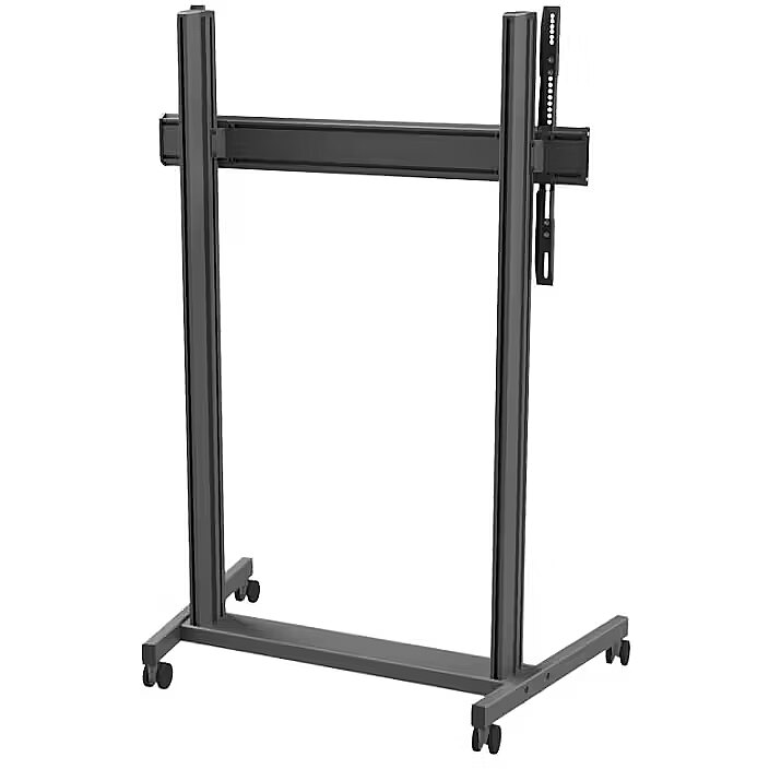 Description - The TRE200 is a professional video conferencing cart designed for modern meeting rooms, offices, educational institutions, and public spaces. It provides a stable and mobile platform for presentations and online meetings using a single screen. Its robust aluminum construction ensures high durability and safe use, while the ergonomic design allows for easy maneuvering and adjustment of the screen position to suit current needs. Smooth height adjustment enables comfortable use of the monitor in various scenarios-during video conferences, presentations, or public speaking events. The TRE200 cart features a system that secures the monitor against accidental falls, ensuring the screen remains stable in the correct position. Non-marking wheels with brakes allow for easy movement of the cart and stable positioning in the desired location. With the ability to mount the screen in either landscape or portrait orientation and wide compatibility with the VESA standard (up to 1000 × 600), the TRE200 works with many professional displays. Additional accessories, such as shelves, can be mounted directly to the support column, allowing easy expansion of the AV setup according to user requirements.