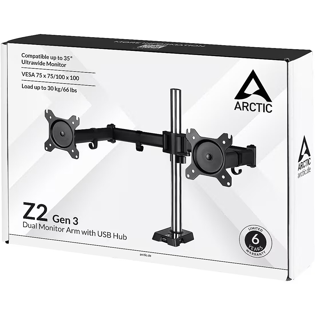 LongDesc - The ARCTIC Z2 is designed to help improve your workflow as well as your health. Its space-saving construction frees up desk space. Included cable management reduces clutter, while the 4-port USB hub allows for convenient connectivity. Easily adjustable height plus turn, tilt and swivel functions allow you to effortlessly achieve an ergonomically correct viewing angle in seconds. Enjoy the new display flexibility and longcomfortable hours in front of your screen.Each mount can hold up to 15 kg (33 lbs), including ultrawide monitors up to 29", so whether you need it for work or for play, the Z2 is a great addition to your setup.