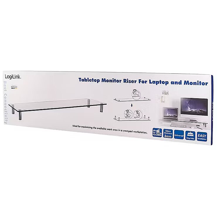 Technical details > Other features - Glass thickness: 5 mm. Material: Steel, glass, metal. Dimension: 1000 x 260 x 93 mm. The LogiLink tabletop monitor riser ensures an optimal view on your monitor. The increased screen changes the viewing angle and at the same time the sitting position.
