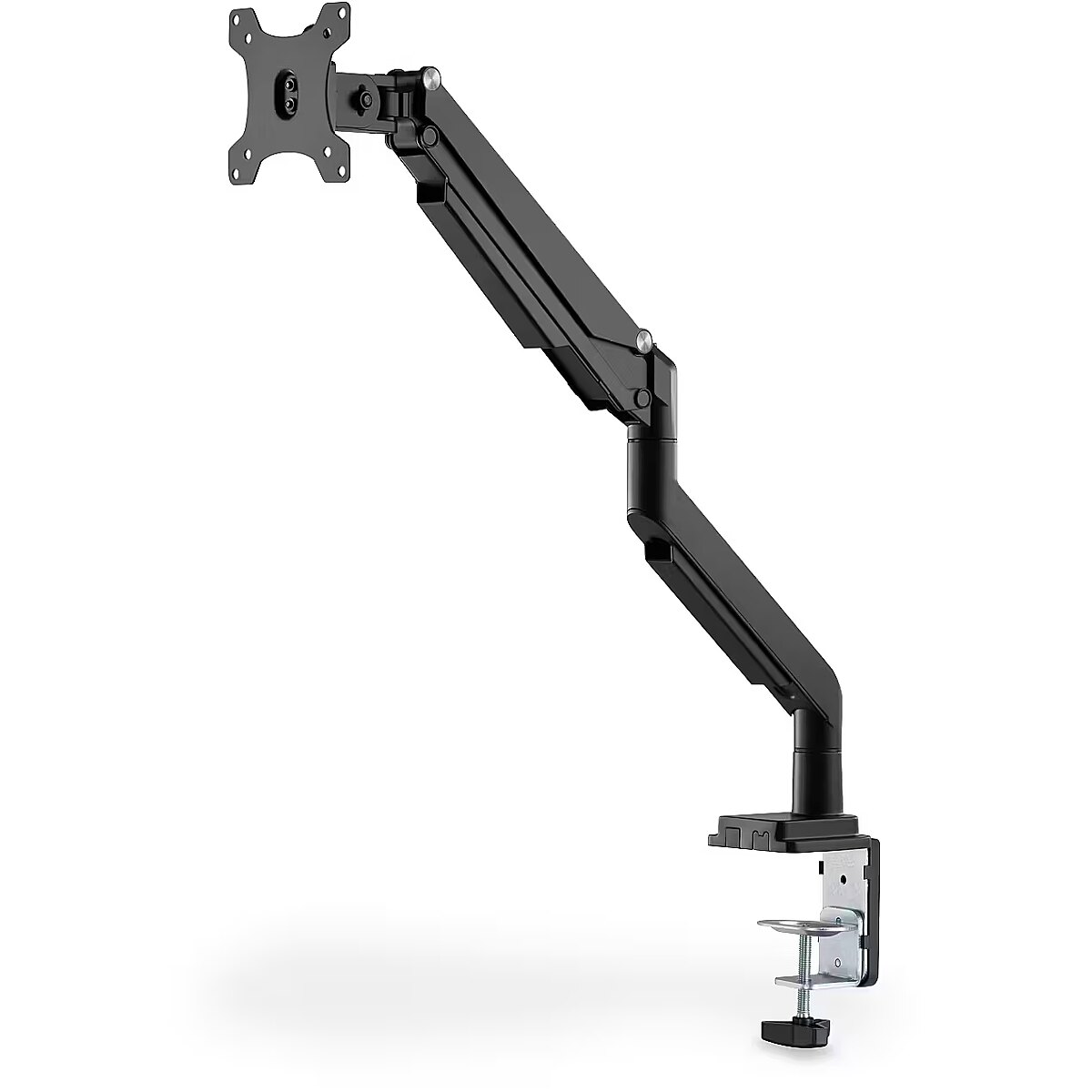 Technical_details - Universal single monitor holder, monitor mount With the universal monitor mount from Digitus, a monitor of sizes 38.1 - 80 cm (15 - 32") can be conveniently attached to the desk using a clamp. The quick-release function also makes it easier to install the monitor. The VESA mount becomes complete simply pushed into the corresponding mount and locks in place automatically. The monitor can be aligned to suit your needs without great effort, and it can be pivoted, tilted or rotated. The support of the integrated gas pressure spring makes it easier to adjust the height of the monitor. In addition, the cables of the Lay monitors neatly through the supplied cable guides. Type: Monitor Mount Color: Black EAN: 4016032465119 Manufacturer No.: DA-90394 To hold/attach: from | monitors To hold/attach: on / on | tables Suitable for: monitors Fastening type: clamping device Max dimensions: screen size | 38.1 - 80cm (15 - 32") Material: steel, aluminum, plastic VESA standards: 75x75mm, 100x100mm Ergonomics: angle of inclination | From +90° to -90° Ergonomics: Tiltable | Yes Ergonomics: Rotatable | ±180° Ergonomics: Swiveling | ±180° Ergonomics: Height adjustable | Up to 335mm Load capacity: 9 kg (1 x 9 kg) Number of supported devices: 1 Feature: Quick release function Further information: For table tops with a thickness of 10 - 85 mm Accessories: Available | Mounting accessories, mounting instructions, cable routing Dimensions: Width: 115mm x Height: 690mm x Depth/Length: 544mm Weight: 3.2kg