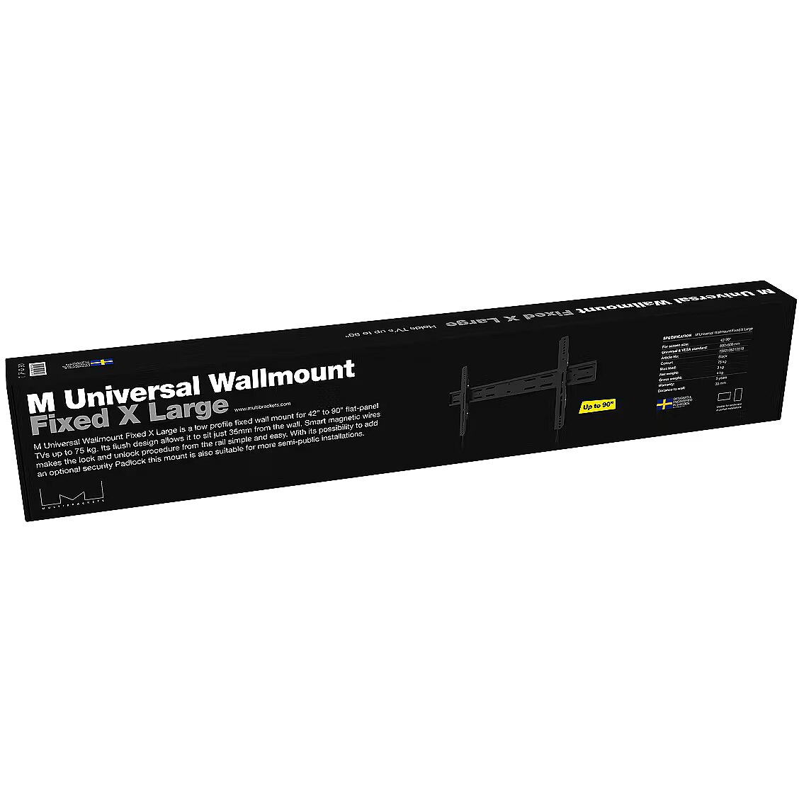 LongSummaryDescription - Multibrackets M Universal Wallmount Fixed X Large. Maximum weight capacity: 75 kg, Minimum screen size: 106.7 cm (42"), Maximum screen size: 2.29 m (90"), Minimum VESA mount: 100 x 100 mm, Maximum VESA mount: 800 x 600 mm. Distance to the wall (max): 3.5 cm. Product colour: Black