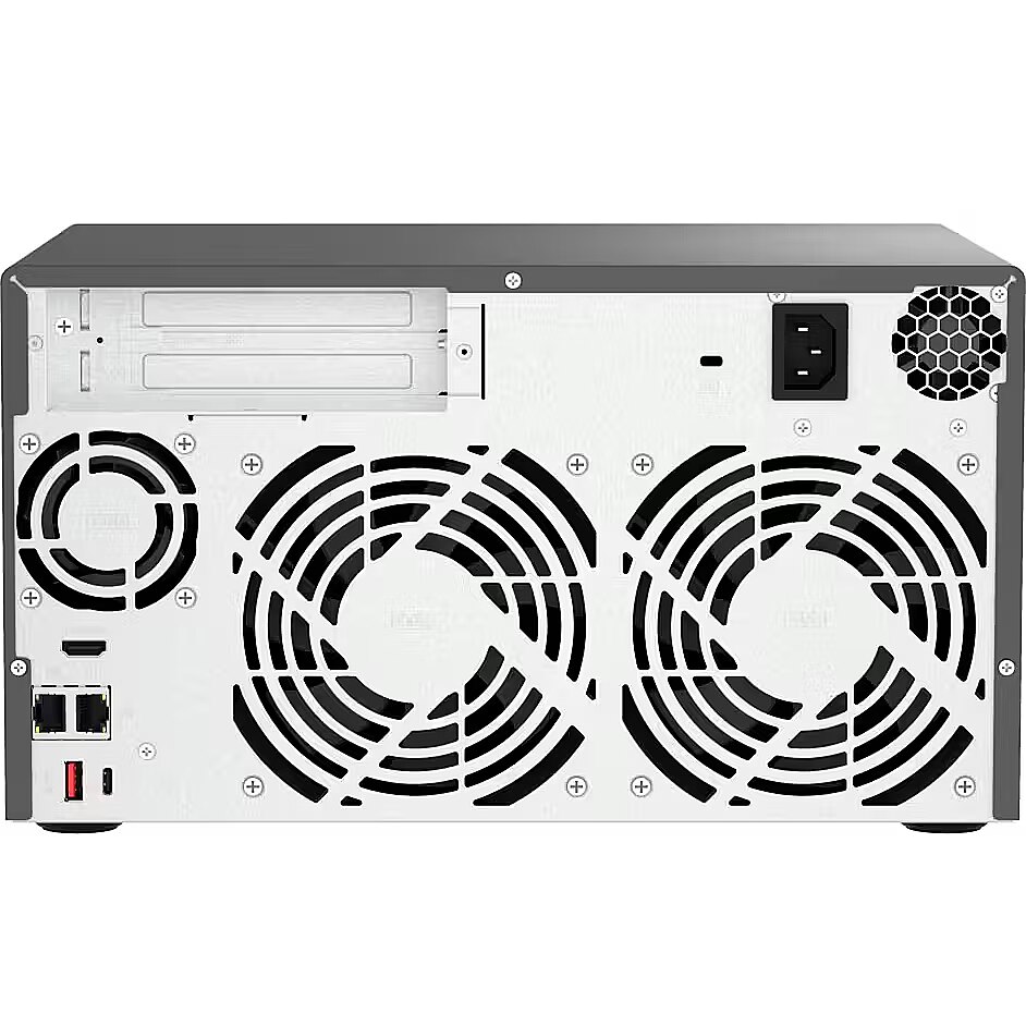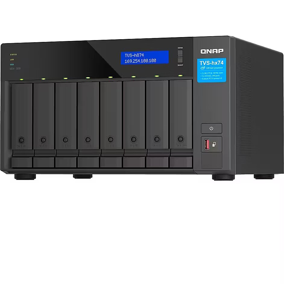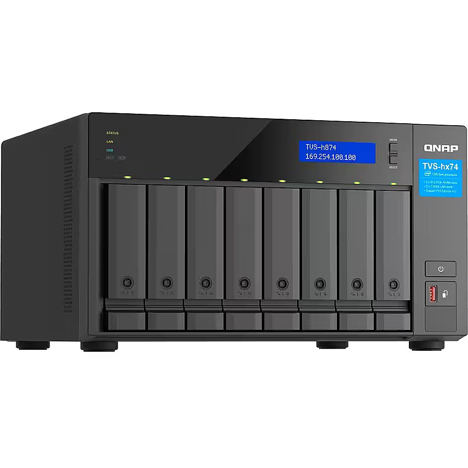 LongDesc - Highly-reliable ZFS-based storage with PCIe Gen 4 expandability for 10/25GbE connectivity, M.2 NVMe SSD caching and multi-threads processors for virtualization applicationsWith an Intel® Core™ multicore-core Processor to support the ZFS-based QuTS hero operating system, the TVS-h874 SMB NAS ensures data integrity and supports block-level inline data deduplication and compression, near-limitless snapshots, real-time SnapSync, and SSD optimization. Whether for mission-critical file servers, virtualization servers, collaborative video editing, or efficient data backup and recovery applications, the TVS-h874 delivers an ideal NAS solution. The high-performance TVS-h874 provides PCIe Gen 4 (up to twice the transmission speed of Gen 3) expandability, M.2 NVMe SSD caching, and 2.5GbE/10GbE connectivity for high-speed virtualization network environments.High-performance Intel® Core™ processorThe TVS-h874 adopts an Intel® Core™ multi-core Processor with Intel® UHD Graphics 770 to increase multi-tasking capabilities, offering SMBs a secure, reliable, and high-performance NAS solution.12th Gen Intel® Core™ Hybrid Technology for Optimized Performance12th Gen Intel® Core™ CPUs leverage the breakthrough Performance Hybrid Architecture, combining Performance-cores with Efficient-cores to greatly enhance the multi-tasking efficiency of x86 architecture. Multiple threads also provide a smoother experience for virtualization applications.Boost NAS performance with M.2 SSDs or TPUThe TVS-h874 has two M.2 PCIe slots, enabling SSD caching or SSD storage pools for improved performance, or other applications.Install M.2 NVMe SSDs for cache accelerationThe TVS-h874 supports SSD caching and features two M.2 slots that support M.2 PCIe NVMe SSDswith 2280 form factors (sold separately) for boosting overall NAS performance.Accelerate AI–powered image recognition with TPUBy leveraging a Google Edge TPU to QNAP AI Core (AI-powered engine for image recognition), the TVS-h874 can perform high-speed face and object recognition. Google Edge TPU enables QuMagie to quickly process thousands of photos with high-speed AI Image recognition and classification, and QVR Face to analyze real-time video for instant facial recognition.Build a High-Speed 10GbE/2.5GbE Network EnvironmentTVS-h874 has two 2.5GbE ports (TVS-h874-i9-64G is preinstalled with a dual-port 10GBASE-T network card). QNAP offers comprehensive, budget-friendly storage and networking solutions that provide an array of connectivity possibilities. Easily and flexibly upgrade your workplace or home network now to handle bandwidth-hungry applications.A fast 2.5GbE/10GbE NASA QNAP NAS featuring one or more 2.5GbE/10GbE ports, and Port Trunking allows you to combine multiple ports for greater bandwidth potential.Upgrade computers and serversServers and desktops can install PCIe-based QNAP network cards that support 10G/5G/2.5G/1G/100M Multi-Gig.Add a 5GbE port to laptopsLaptops and upgrade-limited computers can use QNAP’s portable USB 3.2 Gen 1 to 5GbE adapter that allows you to connect to 5G/2.5G/1G/100M networks via USB.A switch that supports 2.5GbE/10GbEQNAP’s 10GbE/NBASE-T switches support 10G/5G/2.5G/1G/100M and allow connecting multiple workstations and devices for high-speed collaboration in device-dense environments.Abundant I/O capabilities with PCIe expansionThe TVS-h874 has two PCIe slots that allow for installing various expansion cards for expanding application potential.Ultimate visual experience with Full HD HDMI output and real-time video transcodingHDMI outputThe TVS-h874 features HDMI output that supports Full HD, providing great benefits for applications like video production/editing or industrial design that demands high resolution and intensive media storage, transfer, and display.View NAS media or virtual machines on an TVBy connecting the TVS-h874 to an HDMI display, you can directly watch multimedia content saved on the NAS, operate virtual machines from Virtualization Station, or enjoy multimedia using HD Player or third-party players.Real-time transcoding and displayThe TVS-h874 features Intel® UHD Graphics that supports hardware decoding and real-time transcoding* for converting videos to universal file formats that can be smoothly played on multiple devices.Faster image identification with integrated Intel® OpenVINO™ AI engine.With integrated Intel® OpenVINO™ AI computing resources, the TVS-h874 accelerates AI image recognition performance without impacting other applications or services. QNAP AI Core primarily works with the QuMagie application.ZFS-based QuTS hero operating system enhances NAS performance and data integrityQuTS hero combines the app-based QTS with the 128-bit ZFS file system to provide flexible storage management, comprehensive data protection, and optimized performance to tackle the complexity and performance demands of modern IT. From storage management, virtualization, to collaborative media workflows, QuTS hero streamlines your business-critical tasks.Data integrity is keyQuTS hero’s self-healing ensures data integrity and reliability. Write Once, Read Many (WORM) is also supported.Data reduction improves storage efficiency and performanceInline data deduplication, compression, and compaction reduce file sizes to conserve storage capacity and optimize performance.Multi-level cache technologyMain memory read cache (L1 ARC), SSD second-level read cache (L2 ARC), and ZFS Intent Log (ZIL) for synchronous transactions with power failure protection are supported to boost performance and security.RAID Z enables robust data protectionMultiple RAID levels allow flexible capacity utilization. RAID Triple Parity and Triple Mirror deliver higher levels of data protection.QSAL (QNAP SSD Antiwear Leveling) enhances data protectionRAID-level SSD lifespan is automatically and regularly detected to prevent simultaneous SSD failure, improving your data protection and system reliability.App Center