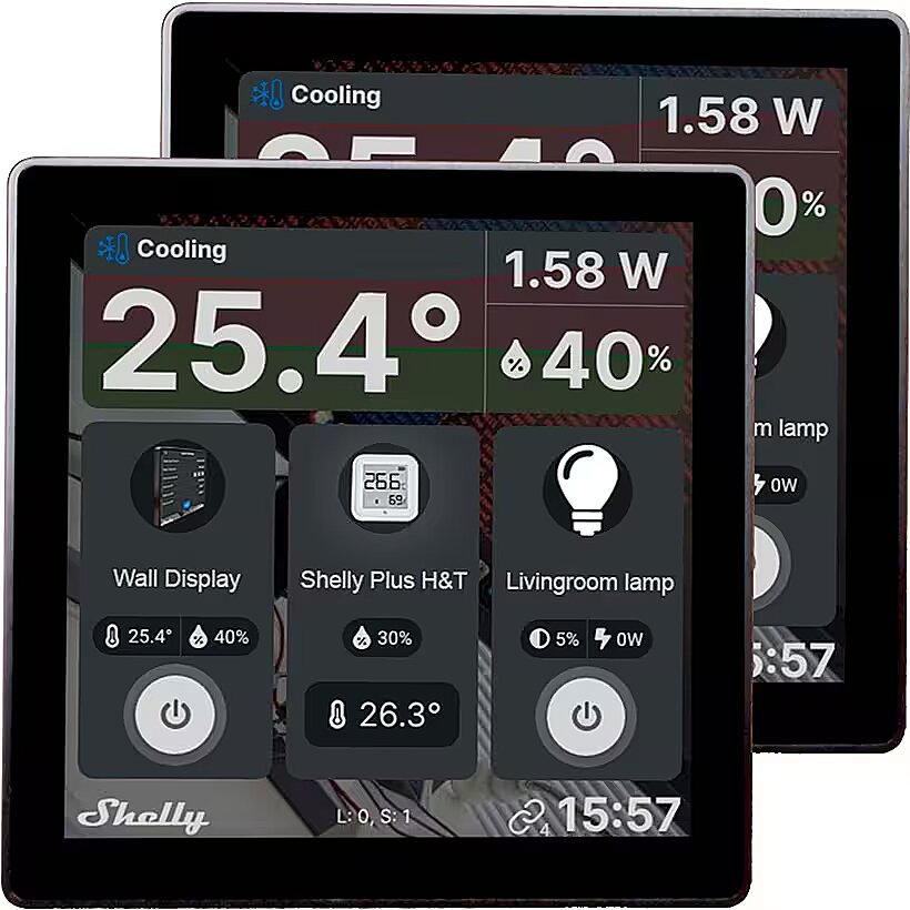 Technical_details - The Shelly Wall display is a smart home control panel with a color display and load circuit switching function. With its minimalist look, a sophisticated UI design and a highly customizable home screen, this display not only fits perfectly into any interior, but also adapts to the needs of the user. The devices used in the household can be monitored and controlled via the color touch display - scene control and scheduling, together with integration for the Shelly Smart Control app, make handling easier. The integrated relay enables lighting control and the power consumption of all devices can also be monitored. The integrated sensors and a room thermostat allow further adjustment of the room climate directly on the device. Item no.: 100031187 Type of control panel Color: Black EAN 4250494929011 Manufacturer no. BUSHWDB Smart home Alexa, Google Home, Homey, Samsung SmartThings, WiFi Device features Note Integrated temperature, humidity and LUX sensors for monitoring and automation Max. transmit (building) 30 m Features touchscreen Indoor use Wi-Fi 802.11 b, 802.11 g, 802.11 n Max. transmission range (free field) 50 m Operating temperature range -20 - 40 °C Bluetooth connection type Radio frequency from 2,400 MHz to 2,495 MHz Further information Functions: easy navigation by swiping right/left, device activation by tapping with more than one finger, Bluetooth gateway, monitoring the power consumption of all devices, Bluetooth 4.2 Dimensions Width: 85mm x Height: 85mm x Depth/Length: 30mm