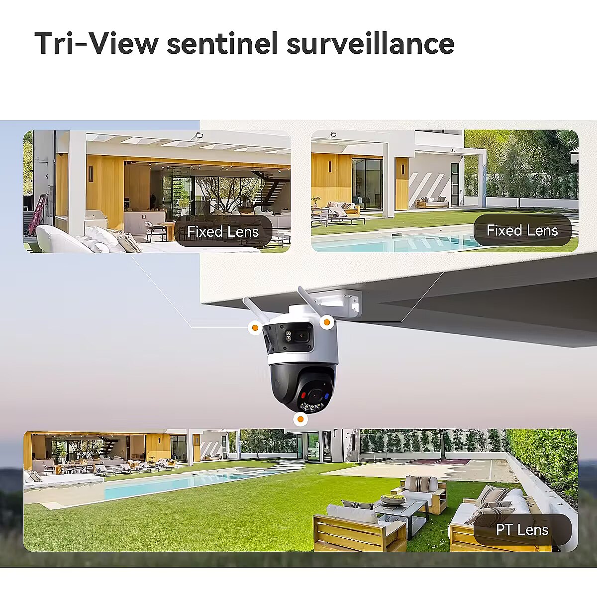 description_en - Tri-View sentinel, flawless insights 3+3+5MP HD Clarity Matrix Click2Track Multi-lens Linkage Always-on Recording Mode AIgo Play Dual SD Card Slots Tri-View sentinel surveillance