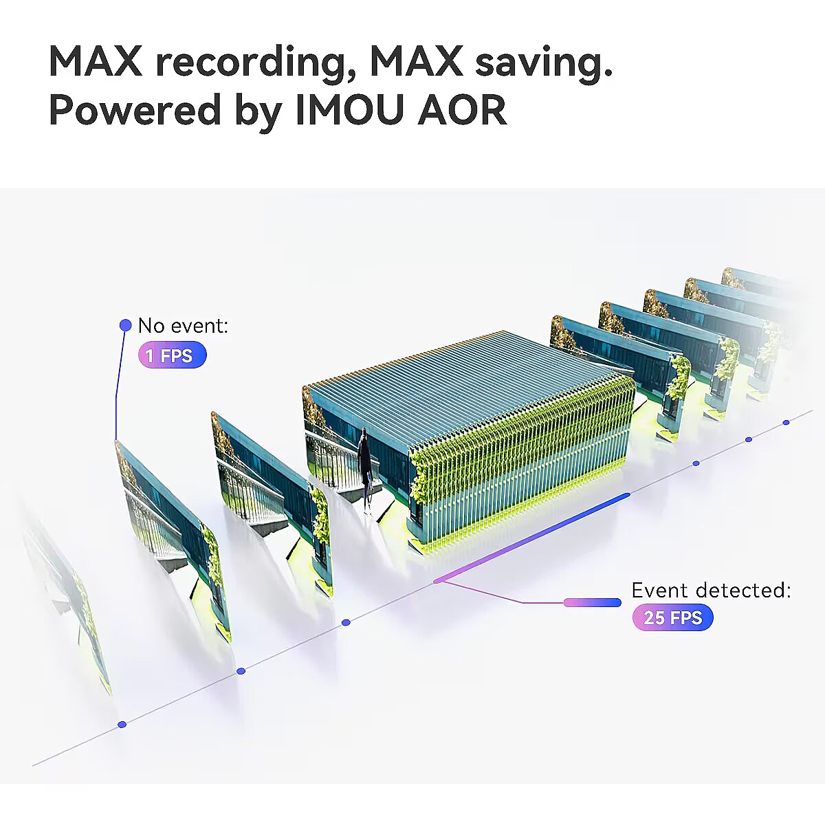 With IMOU's pioneering All-Day Storage Saving Recording(AOR) mode¹, only 1 frame per second is captured when no event occurs, dramatically reducing memory usage, while high-frame smooth video recording occurs when an event is detected. Customize your algorithmic matrix with Algo Play