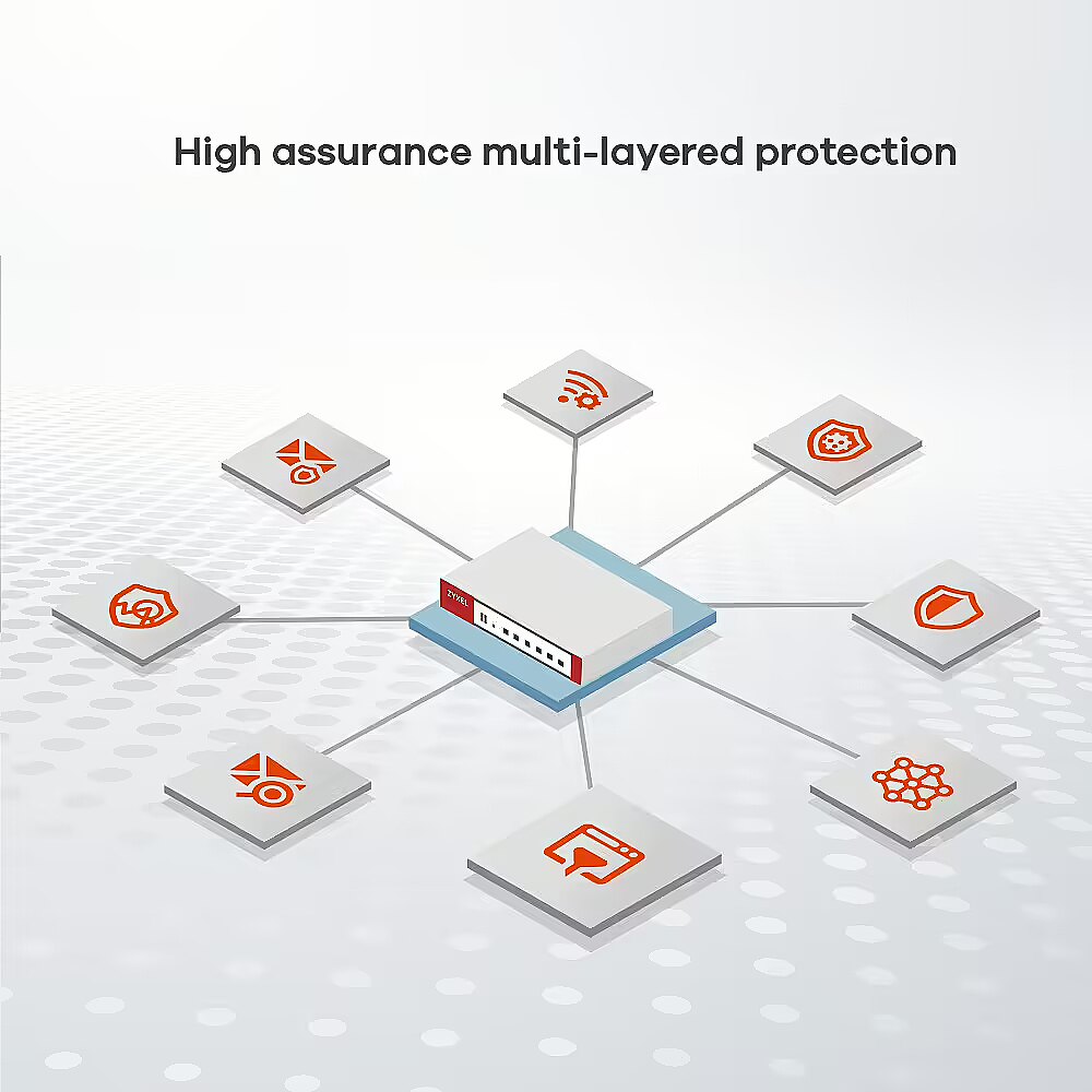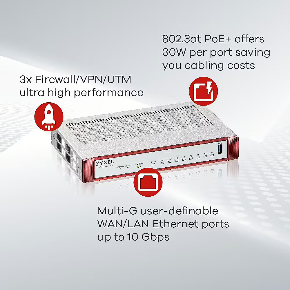 LongDesc - Secure. Fast. Protection USG FLEX H series gives ultra-high firewall/UTM/VPN throughput with multi-gig PoE+ interfaces to get you ready for the upcoming multi-gig era. Empowered by Zyxel AI cloud, it unleashes multi-layered protection for you to enjoy enterprise-grade security at lightning speed. Nebula TogetherWe bring USG FLEX to join the Nebula Cloud Management family. Simply deploying a firewall will not guarantee safety while untrusted devices, users, and applications are accessed widely. Nebula's revolutionary solution brings a Zero-Trust Network Security granular policy to organizations with access authentications and secured WiFi.Best threat intelligence allianceUSG FLEX integrates threat intelligence from leading companies and organizations in the cybersecurity field for scaled information about file and real-time threat data. By leveraging a wider malware coverage with multiple-sourced database, this increases the accuracy in threat detection.High assurance multi-layered protectionUSG FLEX is designed with multi-layer protection against multiple types of threats from in and out. Multiple security services empower you to restrict users' inappropriate application usage or web access. Zyxel offers leading-industry DNS content filter, eliminating blind spots in all encrypted traffic with TLS 1.3 without the need to deploy SSL inspection. *UTM Security Pack license requiredCollaborative Network DefenseThe firewalls detect a threat on any of the connected clients and will sync with the Nebula control center, then automatically respond to cyber threats and contain the device(s) at the edge (Wireless Access Point) of your network. It is a perfect fit for IT to address the requirements of a decentralized network infrastructure and provide automatic protection.*UTM Security Pack license requiredSame Security Across NetworksZyxel's new Secure WiFi feature gives you the ability to create a “drop-in” Access Point that can be configured to replicate the SSID of your office and automatically create a secure tunnel, creating seamless accessibility to your corporate network. This simplifies the deployment by creating a plug-n-play option while maintaining a high level of control over the security of remote workplaces. *Secure WiFi license requiredAnalytics report and enhanced insightsUSG FLEX series dashboard gives user-friendly traffic summary and threat statistic visuals. Utilize SecuReporter for further threat analysis with correlation feature design, making it easy to proactively trackback network status to prevent the next threat event. Centralized visibility of network activities for you to easily manage multiple clients. *UTM Security Pack license required