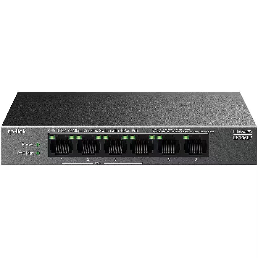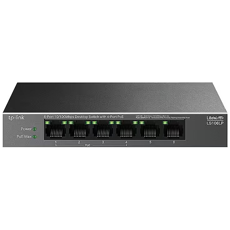 Description - LS106LP 6-Port 10/100Mbps Desktop Switch with 4-Port Po 41 W PoE Budget: Four 10/100 Mbps 802.3af-compliant PoE ports easily connect and power fixed devices like IP cameras, access points, and IP phones via a single cable. Up to 15.4 W PoE output is supported by each PoE port. Up to 250 m PoE Transmission: With Extend Mode, PoE transmission distance reaches up to 250m, perfect for surveillance camera deployment in large areas. PoE Auto Recovery: Automatically reboots your dropped or unresponsive PoE-powered devices. Plug and Play: Simply plug and play for instant connectivity with no configuration required. Silent Operation: Fanless design reduces power consumption and ensures silent operation, ideal for noise-sensitive homes or businesses. Reliable Hardware Design: Durable metal casing and desktop/wall-mounting design are well-suited for different environments.