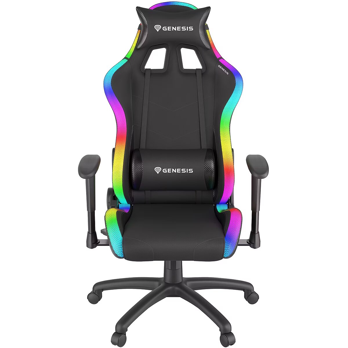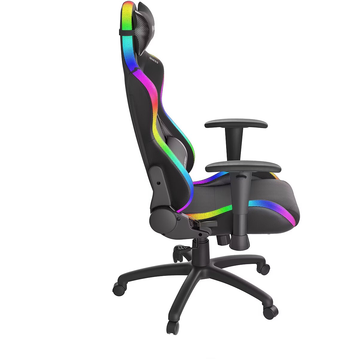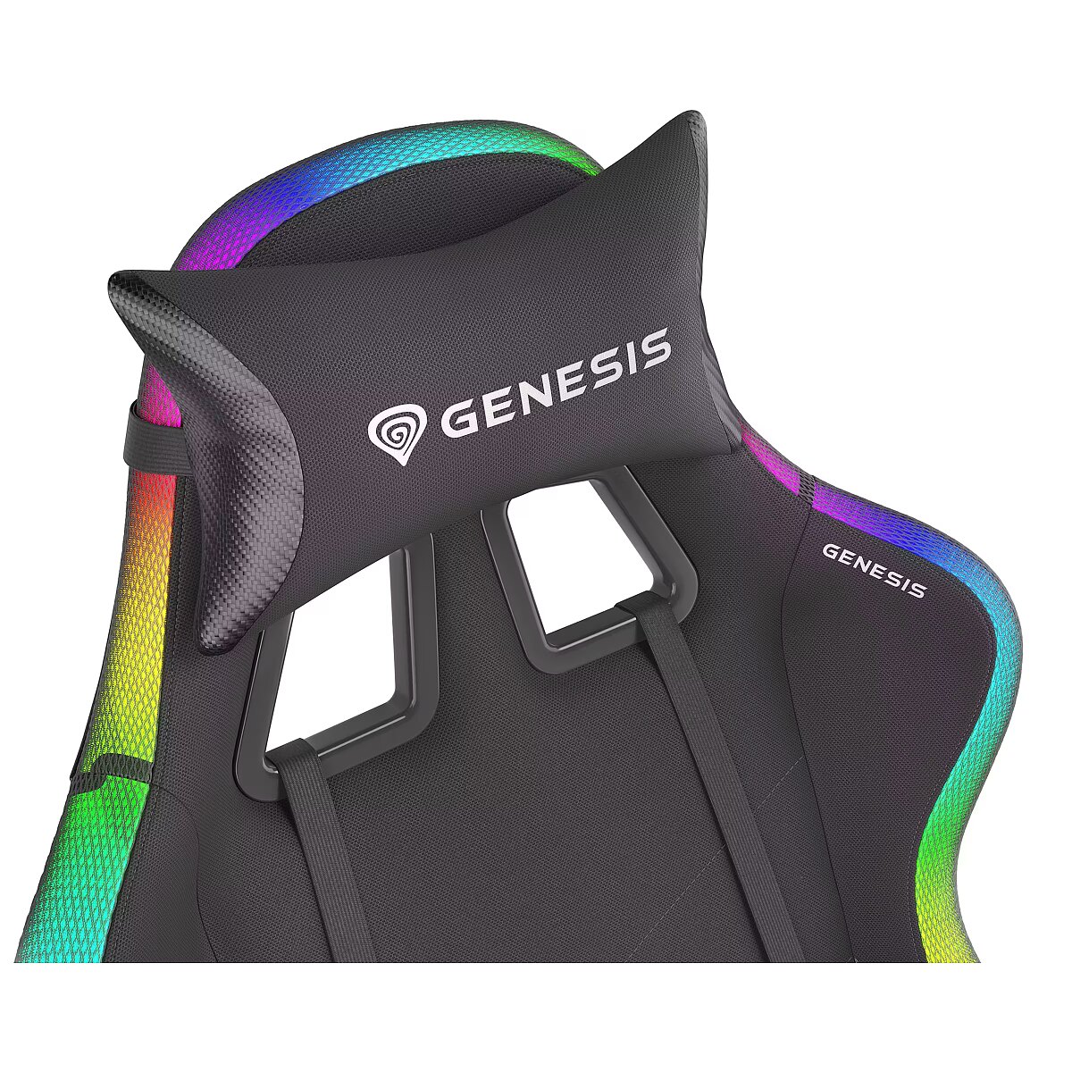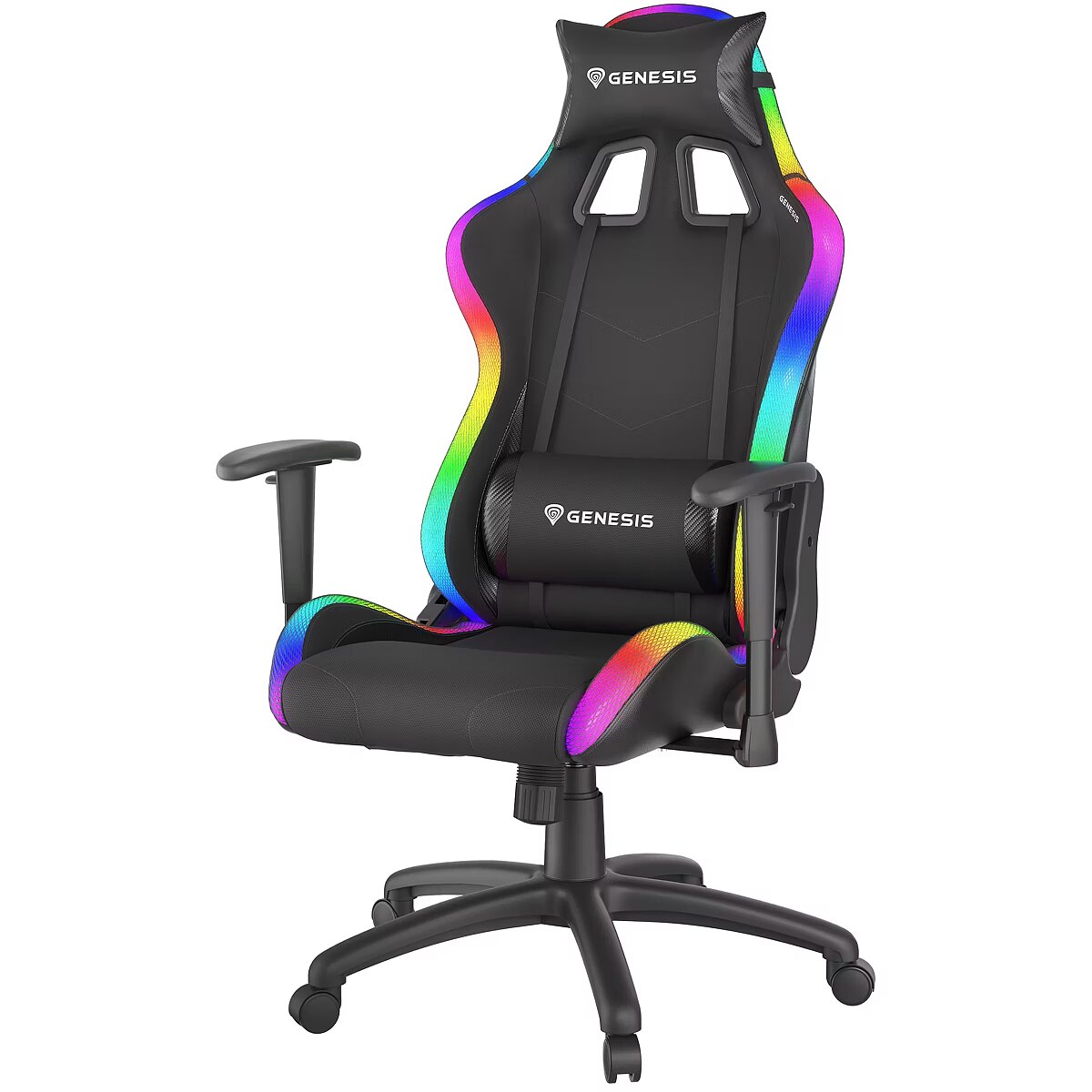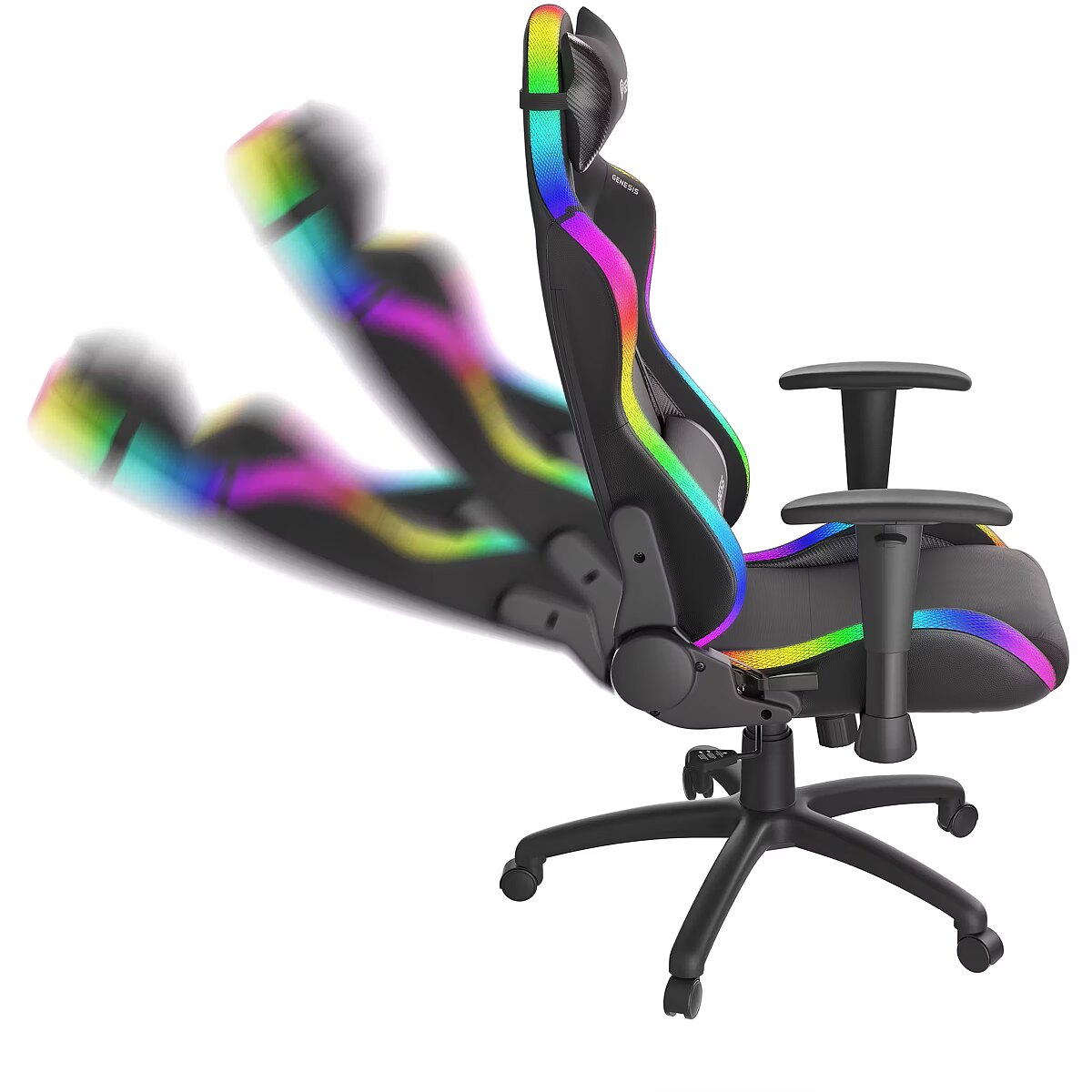 Description - STUN YOUR FOE WITH WITH A COLOURFUL BLOW Genesis Trit 500 meets the requirements of every extreme gamer who search for the best quality, functionality and unique solutions. The seat and backrest are padded with high-quality breathable textile in order to keep the chair ventilated and to give a sense of immaculate comfort during long gaming sessions. Its classic black design fits in with every style, once at the touch of a button it illuminates with the full spectrum of colors and transform your place into ultimate gaming room.  Shine your enemy on to gain another victory! SHINE AT YOUR GAMING WITH UNIQUE BACKLIGHT Daze your opponents with breathtaking backlight! Thanks to over 300 multicolor modes Genesis Trit 500 can look differently any time you want. Remotely controlled backlight enables you to change colors and adjust the speed and brightness of the modes.The backlight should be powered by a powerbank*, placed in a specially designed pocket under the seat to avoid cable-management issues.  *Powerbank not included. YOUR TRUSTWORTHY COMPANION Apart from the remarkable backlight, Genesis Trit 500 is above all a comfortable gaming chair. Inadequate height settings or improper angle of the backrest can result in disappointing ending of the battle. The fatigue and discomfort decrease efficiency and disturb concentration. With the whole range of features such as height and backrest angle adjustment, you can set the chair to your own preferences and be sure your body stays in the optimal posture. FOR BATTLE AND RELAXATION The head and lumbar cushions will support your back and head and ease any tensions so that you can focus only on your mission. Additionally, the armrests can be adjusted up and down to match the best hand position. Finally, with its rocking function Trit 500 gives you a perfect tool to rest and relax between the games. UNFAILING FOR YEARS Thanks to its abrasion-resistant breathable textile Trit 500 will serve perfectly in every weather condition. The fabric ensures optimal air circulation so that even in the hottest days you will feel comfortable and cool. The Carbon-styled ornaments plus the mesh textile that covers the backlight gives the chair attractive look and style. The chair is equipped with gas-lift with load-carrying capacity of up to 120 kg. With its strong metal construction covered with high-quality foam resistant to any deformation Trit 500 will serve you for years. REMARKABLE RUNNER The durable base guarantees stability even during the most energetic game. With its 50 mm castors you gain optimal mobility without leaving any scratches on the floor. You can be sure Genesis Trit 500 will become the reliable companion of your exciting adventures giving you the chance to alter your ego every day: from a black hat to a bright mage to a bloody rebel.  Always strong, always comfortable, always unique!