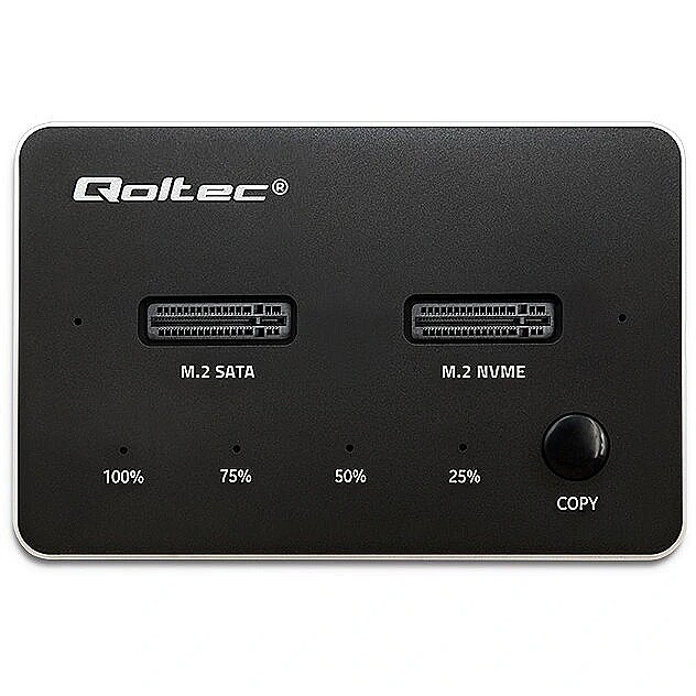 The station is compatible with M.2 drives with SATA and NVMe interfaces. It offers data transfer rates of up to 10 Gbps. In addition, the disk station from Qoltec is a device: Suitable for M-Key and B&M-Key NGFF SSDs with sizes: 2230, 2242, 2260, 2280, 22110, Support of the UASP standard, allows several commands to be executed at the same time, USB 3.1 Gen2 interface enables data transfer at a speed of 10 Gb/s, The device is compatible with USB 3.1 Gen1 and USB 2.0, Good stability of the device thanks to non-slip pads, LED indicates copy status (25%, 50%, 75%, 100%), Single M.2 drive supports up to 2TB, total capacity 4TB, Useful when there is no other way to connect an SSD, No need to install drivers, simply plug into a USB port and use thanks to the simplicity of the Plug&Play function. High-speed data transfer, two options for copying data