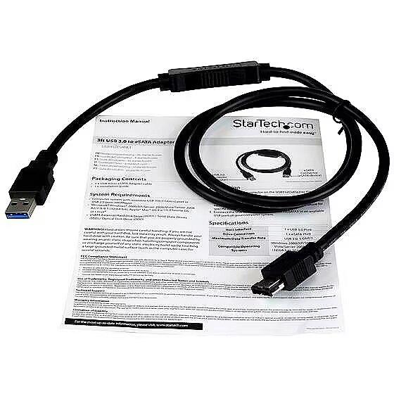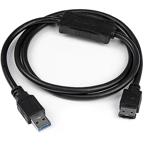 LongDesc - Connect an eSATA storage device to a USB 3.0 port on your laptop or desktopThe USB3S2ESATA3 USB 3.0 to eSATA drive cable lets you connect any external eSATA hard drive, solid state drive, or optical disc drive to your USB-enabled computer system -- a great solution for computers that don't natively support eSATA, such as MacBook and Ultrabook computers.To maximize performance and utilize the speed potential of your SATA 6 Gbps drives, the USB 3.0 to eSATA adapter is compatible with SATA revisions I/II/III and supports transfer speeds up to 5 Gbps through USB 3.0.With support for Blu-ray/DVD/CD ATAPI / ODD drives and large capacity HDD / SSDs (tested up to 4TB) the USB to eSATA adapter cable is compatible with virtually any eSATA device, and can greatly increase the storage/backup capabilities of your computer.The USB 3.0 to eSATA drive cable ensures a hassle-free connection with simple plug-and-play installation, plus the cable is the perfect length (1-meter, end-to-end) for easily accessing the rear panel USB ports on your computer.The USB3S2ESATA3 is backed by a StarTech.com 2-year warranty and free lifetime technical support.The StarTech.com Advantage- Get high external performance from your eSATA drives, with transfer speeds up to 5 Gbps using your USB 3.0-enabled computer- Hassle-free set up, with plug-and-play installation