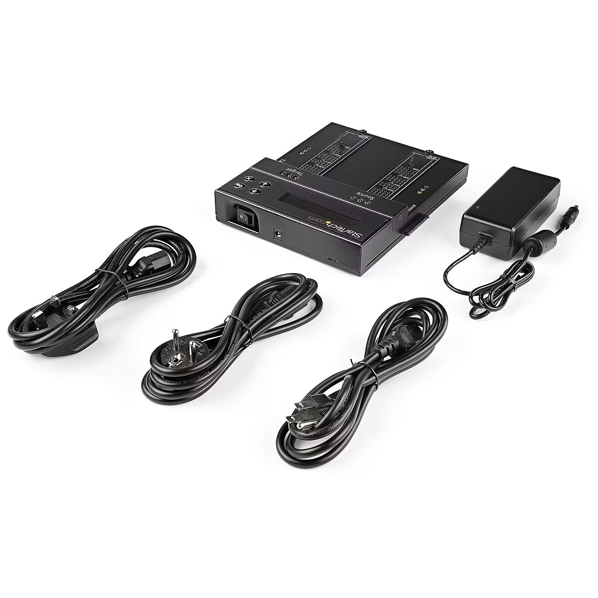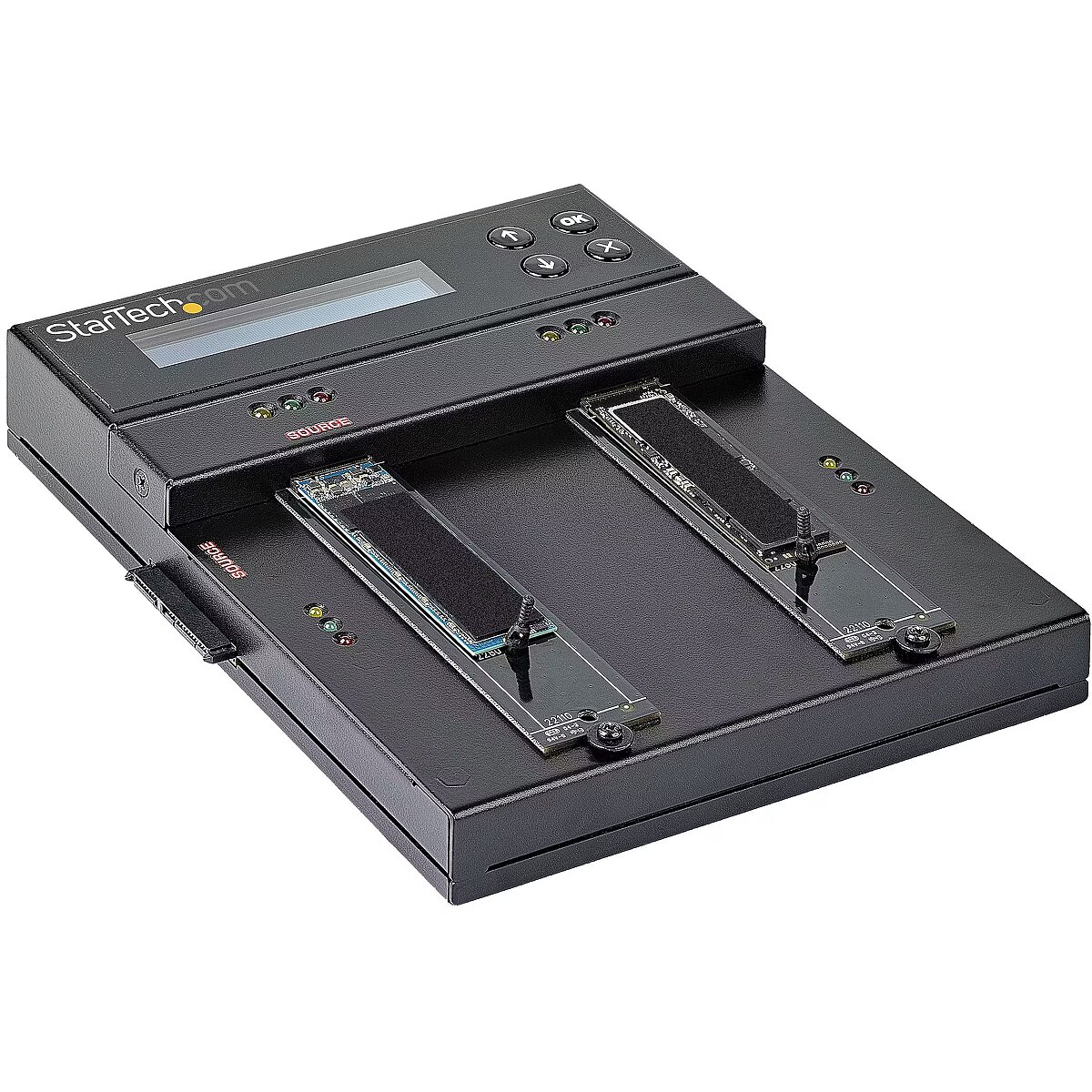 LongDesc - Hostless Drive Duplicator and Eraser | PCIe M.2 | SATA M.2 | 2.5 in. SATA | 3.5 in. SATAThis flexible 1-to-1 drive duplicator and eraser provides a standalone solution for cloning and sanitizing hard drives (HDD) and solid state drives (SSD) without computers or software. The drive duplicator/sanitizer can clone drives at up to 7.5GB per minute, and supports a wide variety of drive types:• M.2 PCIe drives (sized 2230/2242/2260/2280/22110)• M.2 SATA drives (sized 2230/2242/2260/2280/22110)• 2.5 in. SATA drives• 3.5 in SATA drivesBroad Drive CompatibilitySupporting different types of drives including M.2 PCIe (M-Key), M.2 SATA (B+M-Key), and SATA 2.5/3.5 in. drives, this HDD/SSD cloner and wiper provides a versatile solution for drive cloning and deleting applications. The drive cloner enables duplication with any combination of drives, supporting duplication between M.2 (NVMe/AHCI), M.2 SATA, and 2.5/3.5" SATA drive interfaces. You can also expand the capabilities of the device to supporting IDE and mSATA drives using StarTech.com drive adapters: SATA to IDE Adapter (SAT2IDEADP) / SATA to mSATA Adapter (SAT32MSAT257) (each sold separately).To ensure compatibility with your drives the duplicator and eraser has been rigorously tested with a wide variety of drive models from different drive manufacturer including Samsung 850, 860, 870, 950, 960, 970, WD, HP, and Intel.Configurable Duplication and Erase ModesTo support a wide variety of applications this drive cloner and sanitizer supports different duplication and erasing modes with Adjustable Host Protected Area (HPA) settings to include/exclude partitions. When duplicating the device supports: System & File, All Partitions, Whole Drive and Percentage Duplication. When erasing the device supports: Quick Erase, Full Erase (Single & 3-Pass) and Secure Erase (Clear/Purge, meets NIST SP 800-88 Rev 1).Easy to UseFeaturing an intuitive button-operated interface, and full on-screen display (OSD) for increased manageability, this drive duplicator and cloner is easy to operate. To monitor and observe your duplication and erasing processes the device features LED indicators for Power/Activity, Status and Errors, and the OSD Menu options include Error Reporting, and Presenting Drive Info.The Choice of IT Pros Since 1985StarTech.com conducts thorough compatibility and performance testing on all our products to ensure we are meeting or exceeding industry standards and providing high-quality products to IT Professionals. Our local StarTech.com Technical Advisors have broad product expertise and work directly with our StarTech.com Engineers to provide support for our customers both pre and post-salesSM2DUPE11 is TAA compliant and backed by a StarTech.com 2-year warranty and free lifetime 24/5 North American based, multi-lingual support.The StarTech.com Advantage