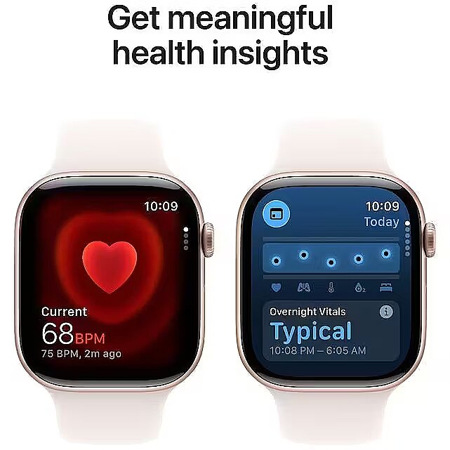 Hypertension, or high blood pressure, impacts over 1.3 billion adults worldwide and is a leading cause of a heart attack, stroke, and kidney disease. The condition frequently goes undiagnosed because it often has no symptoms — and even during a doctor’s visit, with a single measurement it can be easily missed. Receive hypertension notifications just by wearing your watch. Series 11 can notify you if it identifies patterns of hypertension. How? The optical sensor provides data to an algorithm that can detect potential hypertension by analyzing how your blood vessels respond to beats of the heart over 30-day periods. Groundbreaking insights. Grounded in science. We developed hypertension notifications using advanced machine learning methods and a series of studies totaling over 100,000 participants. The feature was then validated in a clinical study. Set up a blood pressure log. If you receive a hypertension notification and have access to a blood pressure cuff, you can track your blood pressure in the Health app on iPhone to create a report that will lead to more meaningful conversations with your healthcare provider. More features to empower your health. Wake up to your sleep score. Sleep quality is influenced by factors such as sleep duration, bedtime consistency, how often you wake up, and time spent in each sleep stage. Sleep score analyzes these factors every night and provides a classification and a score. You’ll see how the score is calculated, so you can understand the quality of your sleep and learn how to make it more restorative. Wake up to your sleep score. Sleep quality is influenced by factors such as sleep duration, bedtime consistency, how often you wake up, and time spent in each sleep stage. Sleep score analyzes these factors every night and provides a classification and a score. You’ll see how the score is calculated, so you can understand the quality of your sleep and learn how to make it more restorative. The Vitals app. Your daily health status, stat. Quickly see your overnight health data — including heart rate, respiratory rate, wrist temperature, and sleep duration — and get notified if multiple metrics are ever outside your typical range. Follow your heart on the ECG app. With Series 11 you can check for signs of atrial fibrillation, or AFib, right from your wrist by using the ECG app to generate a single-lead electrocardiogram. Stay on the pulse with the Heart Rate app. You can check your heart rate at any time — and get automatic notifications for a high or low heart rate or an irregular rhythm. Cycle Tracking keeps you in the loop. Since cycles vary, the best way to understand what’s normal for you is by tracking your menstrual cycle. You can use Cycle Tracking to log your period, record symptoms, and get predictions about your next period or fertile window. It can also notify you if a cycle deviation is detected. Get retrospective ovulation estimates. Series 11 has advanced sensors that track your wrist temperature while you sleep. The Cycle Tracking app uses this data to provide a retrospective estimate of when you likely ovulated, which can be helpful for family planning. Measure your blood oxygen. It’s a breathtaking innovation. The Health app on iPhone uses data from the sensor in Apple Watch to enable you to take on-demand readings of your blood oxygen as well as background readings, day and night. Fitness Better by every measure.