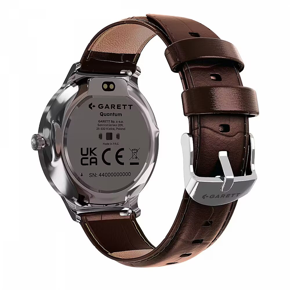 Description - Garett Quantum. Czas, który dotrzymuje kroku Wytrzymała konstrukcja z ekranem AMOLED i szkłem Gorilla Glass zapewnia gotowość do działania w każdych warunkach. Garett Quantum śledzi zdrowie, aktywność i powiadomienia, by wspierać codzienność, trening i chwile pełne energii. Bransoleta i pasek. Elastyczność w standardzie Garett Quantum oferuje dwa warianty stylu w jednym zestawie stalową bransoletę w eleganckim wydaniu oraz skórzany pasek do codziennego użytku. Zestaw dostępny jest w dwóch kombinacjach kolorystycznych: czarna bransoleta stalowa połączona z czarnym paskiem skórzanym lub srebrna bransoleta stalowa zestawiona z brązowym paskiem skórzanym. Dzięki dołączonemu narzędziu regulacja bransolety jest szybka i precyzyjna, a zegarek zawsze leży idealnie. AMOLED 1,43 z Always On Display. Inteligencja na ekranie Zaawansowany ekran AMOLED o przekątnej 1,43 wyświetla każdy szczegół z pełnym kontrastem i czytelnością. Funkcja Always On Display zapewnia stały dostęp do godziny, a bogata biblioteka tarcz pozwala spersonalizować smartwatch zgodnie z indywidualnym stylem sportowym, casualowym lub nowoczesnym. Szkło Gorilla Glass. Wytrzymałość na co dzień Wyświetlacz osłania odporne na zarysowania szkło Gorilla Glass, stworzone, by sprostać tempu codziennych wyzwań i zapewniać pełną czytelność w każdej sytuacji. Smukły design. Maksymalna wygoda Ultracienka konstrukcja 7,5 mm gwarantuje komfort w każdej sytuacji, a obrotowy przycisk funkcyjny zapewnia szybki i precyzyjny dostęp do wszystkich opcji smartwatcha. Tydzień bez przerwy Garett Quantum działa nieprzerwanie nawet przez tydzień, a kiedy wymaga uzupełnienia energii, praktyczna podstawka USB pozwala zrobić to łatwo i bez wysiłku. Forma pod kontrolą Ponadczasowy design łączy się z praktyką Garett Quantum rejestruje puls, ciśnienie, poziom tlenu we krwi, sen i stres. Dzięki natychmiastowym danym łatwiej planować treningi, regenerację i codzienne aktywności. Rozmowy w zasięgu nadgarstka Garett Quantum umożliwia prowadzenie rozmów bezpośrednio ze smartwatcha dzięki wbudowanemu mikrofonowi i głośnikowi. Asystent głosowy uruchamiany jednym poleceniem to wygoda i dyskrecja w każdej sytuacji. Trening w najlepszym wydaniu Garett Quantum został zaprojektowany, by towarzyszyć podczas każdej aktywności od codziennych spacerów po intensywne treningi. Krokomierz i licznik kalorii pomagają monitorować wysiłek i motywują do przekraczania własnych granic. Kompatybilność bez kompromisów Garett Quantum w pełni współpracuje z Androidem i iOS, zapewniając synchronizację w czasie rzeczywistym. Autorska aplikacja Garett Smart łączy zabezpieczenia na wysokim poziomie, intuicyjny interfejs i niezawodną stabilność działania.