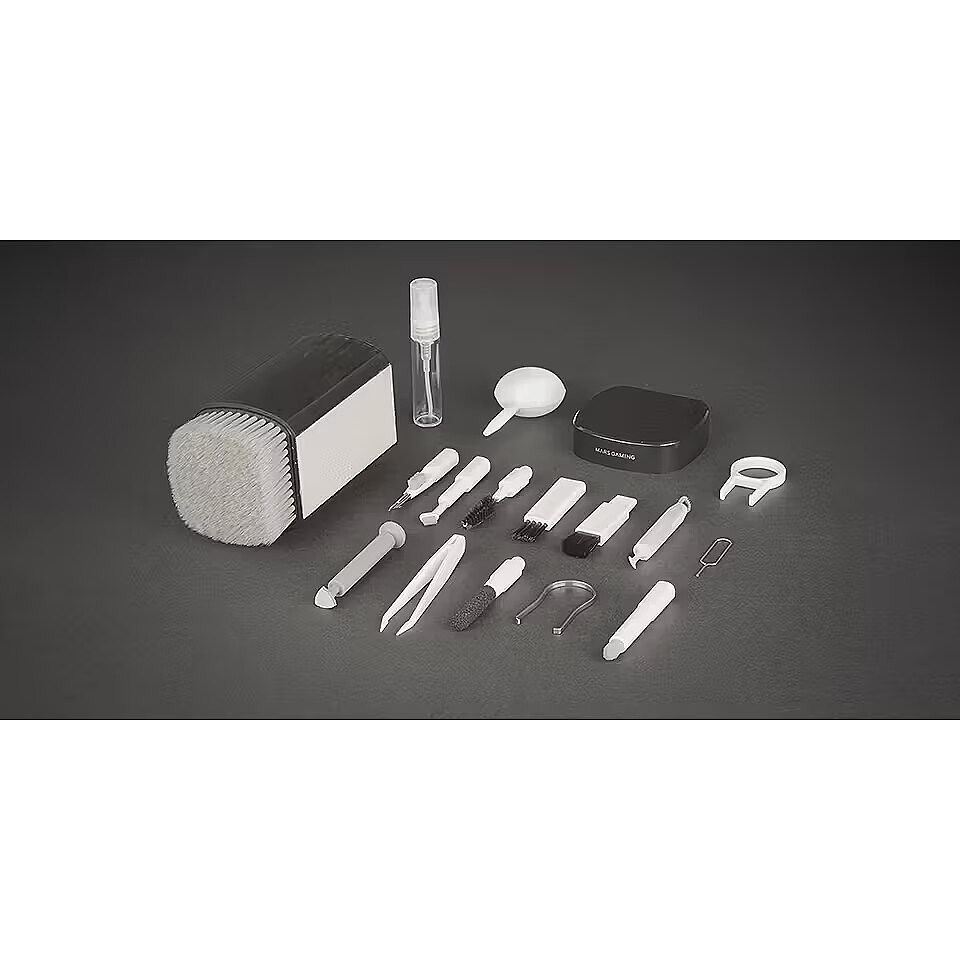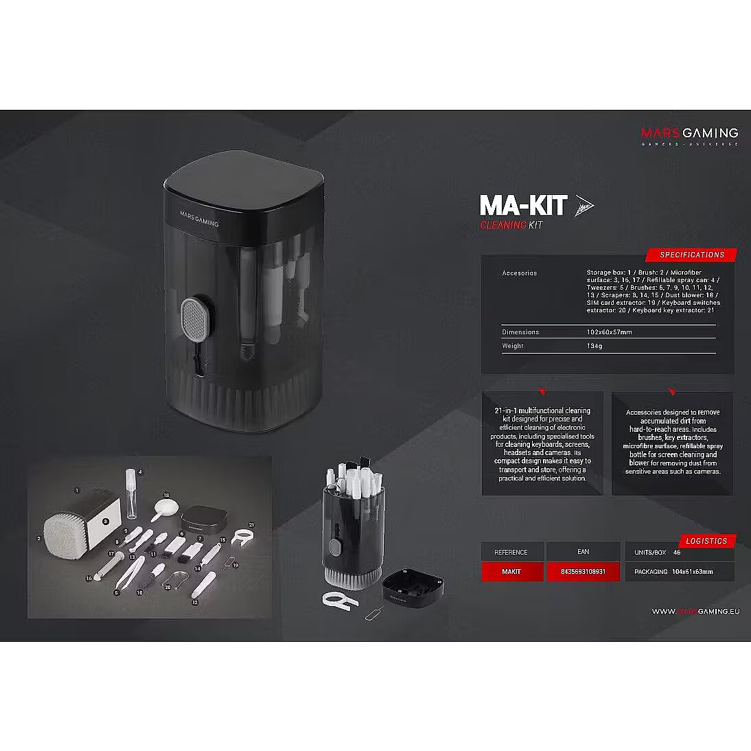 LongDesc - The MA-KIT 21-in-1 Cleaning Kit is the ultimate solution for maintaining your electronic devices. Designed for professional performance, it includes specialized tools for cleaning keyboards, screens, headphones, and more. Each accessory performs a specific function to keep your devices looking new by removing accumulated dirt, dust, and residue. With its compact and portable design, this kit is the perfect companion to take care of your devices on the go.All-in-one cleaning kitKeep your devices spotless with this complete cleaning kit. It includes tools such as high-density brushes, microfiber surface, cleaning pens, and key and switch pullers. Compatible with headphones, smartphones, tablets, laptops, monitors, and more. Organized in a compact case, it's ideal for use at home, in the office, or on the go, offering a one-stop solution for removing dirt and keeping your devices looking like new.Deep and detailed cleaningTake maintenance to the next level with specialized tools. - High-density brush: Designed to effectively remove dust and debris from the surface of your keyboard, leaving every key spotless. Take maintenance to the next level with specialized tools. - Key and switch puller: Perfect for mechanical keyboards, it facilitates the safe and quick disassembly of parts, allowing for deep cleaning. - Cleaning slots and small devices: The metal tip pen precisely removes stubborn dirt in earcups, slots, narrow edges and small gaps. The sponge brush effectively cleans compartments such as charging boxes and connections, while the mini brush is ideal for acoustic vents, ports and other limited-access areas.Specialized Care for Screens and LensesSafely protect and clean your screens with the microfibre surface included in the kit. Fill the spray bottle with your favourite cleaning fluid, lightly spray the screen and remove fingerprints and oil stains without worrying about damaging it. Perfect for monitors, tablets, mobile phones and camera lenses, it ensures a clean, scratch-free finish.