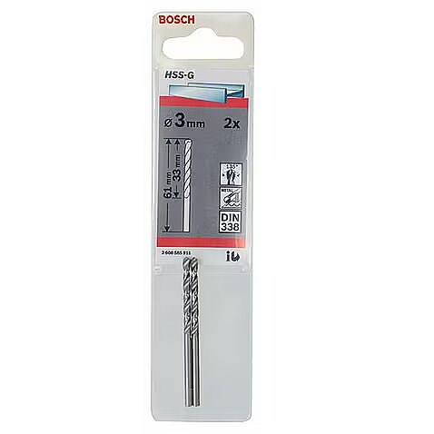 LongSummaryDescription - Bosch Metal drill bit HSS-G, DIN 338. Proper use: Drill, Drill bit type: Twist drill bit, Drill bit diameter: 3 mm. Number of drill bits: 2 pc(s)