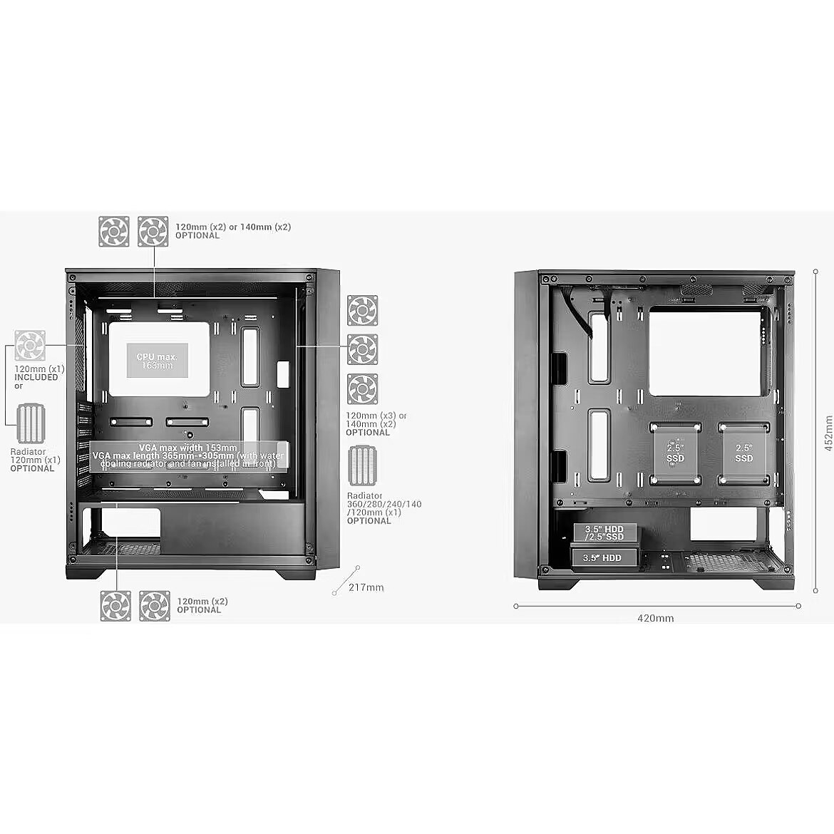 Supports Liquid Cooling: 360mm, 280mm, 240mm, 140mm, 120mm front / 120mm rear