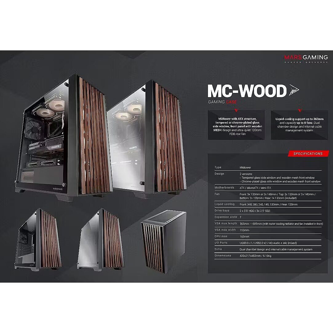 LongDesc - The MC-WOOD combines natural materials and cutting-edge technology in a design that balances aesthetics and functionality. Its unique real wood front, complemented by a fine-lined metal frame, lends a unique and elegant character to any setup. Equipped with an ultra-quiet 120mm FDB fan and support for liquid cooling up to 360mm, it ensures efficient thermal performance right out of the box, keeping your rig cool and quiet at all times. Available with a tempered glass side panel, to highlight every detail of your setup, or chrome glass, for a modern finish, the MC-WOOD adapts to your style.STYLE AND PERFORMANCEThe MC-WOOD is a perfect combination of natural design and advanced technology. With its wooden front, minimalist structure and advanced technical capabilities, it transforms any configuration into a unique setup. Perfect for gaming setups, workstations or enthusiasts looking for a balance between style and performance.Available in two versionsTempered glass and chrome glassSIDE WINDOW: ONE FOR EVERY STYLEThe MC-WOOD offers two side panel options to suit each user's preferences. Tempered glass provides a clear and elegant view of the interior, ideal for those who want to highlight their equipment configuration. On the other hand, chrome glass provides a more sober and modern touch, offering a combination of style and discretion.OPTIMIZED INTERNAL CAPACITYDesigned to support high-performance components, the MC-WOOD offers an ideal solution for demanding builds. It supports graphics cards up to 360mm and features 7 expansion slots, offering great flexibility for advanced configurations. Its dual-chamber internal design is optimized for tidy cable management, achieving a clean and efficient build.CONNECTIVITY AND PRACTICAL MAINTENANCEThis computer case features USB3.0, USB2.0, HD Audio and microphone ports, ensuring compatibility with modern devices and cutting-edge peripherals. Magnetic dust filters on the top and removable dust filters on the bottom make maintenance easy, keeping your equipment clean and protected.WOODEN FRONTThe MC-WOOD’s front design combines the warmth of natural wood with advanced engineering. This panel optimizes airflow to keep components at optimal temperatures, even during long sessions of intensive use. In addition, its minimalist metal structure perfectly complements the design, blending into any space.ADVANCED COOLINGThe MC-WOOD is designed to ensure optimal thermal performance. It offers space for up to 8x 120mm fans and support for up to 360mm liquid cooling, ideal for maintaining stable temperatures in advanced systems. An ultra-quiet FDB rear fan is included as standard, combining efficiency and minimal noise level.