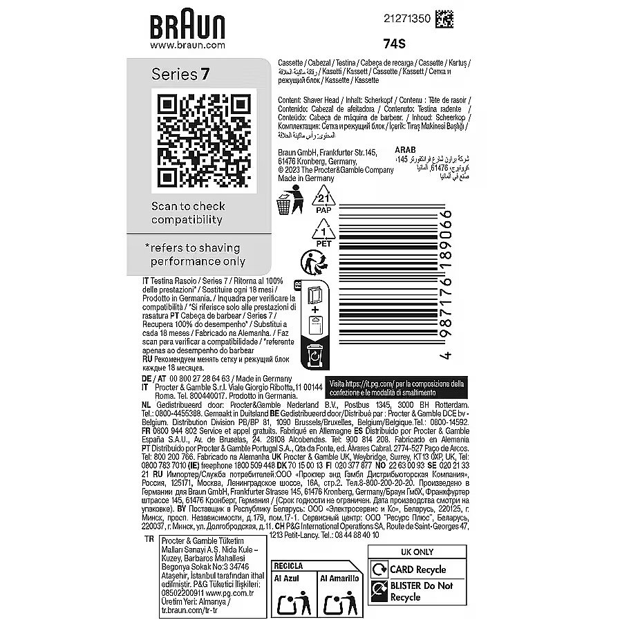 ShortSummaryDescription - Braun Series 7 74 S, Shaving head, 1 head(s), Black, Stainless steel, 18 month(s), Braun, Series 7