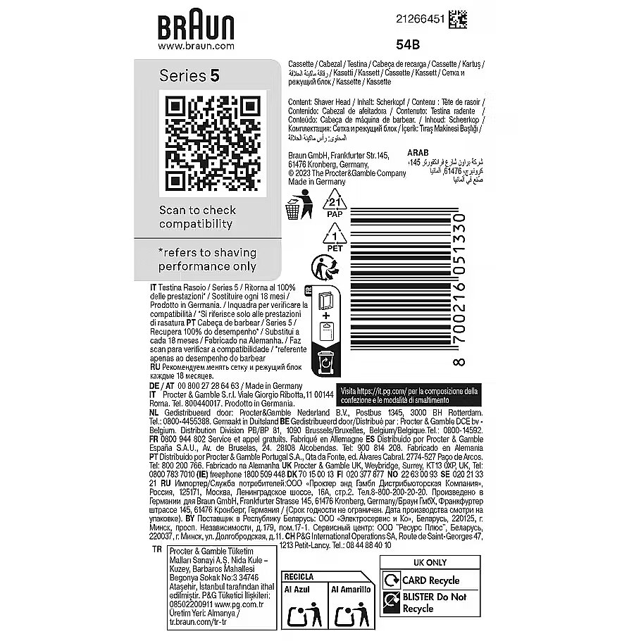 ShortSummaryDescription - Braun Series 5 54 B, Shaving head, 1 head(s), Black, Stainless steel, 18 month(s), Braun, Series 5 54 B